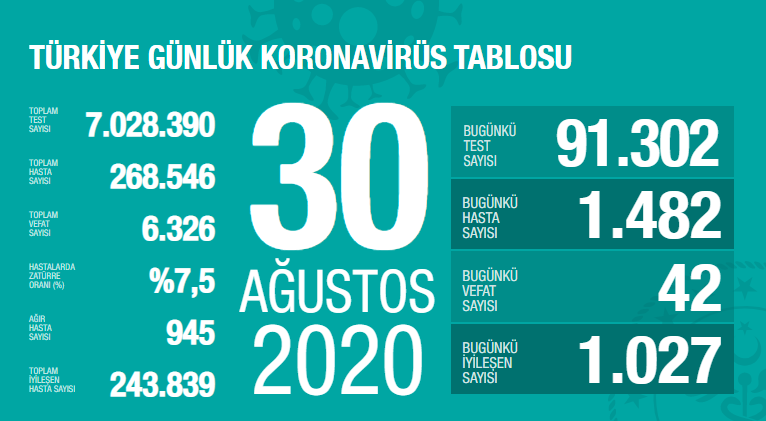 Sağlık Bakanı Fahrettin Koca, bugün (30 Ağustos) COVID-19 nedeniyle 42 hastanın daha hayatını kaybettiğini, 1482 yurttaşın da koronavirüs testinin pozitif çıktığını açıkladı.