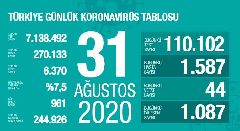 Sağlık Bakanı Fahrettin Koca, bugün (31 Ağustos) COVID-19 nedeniyle 44 hastanın daha hayatını kaybettiğini, 1587 yurttaşın da koronavirüs testinin pozitif çıktığını açıkladı.