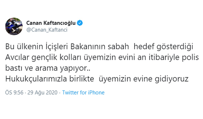 Kaftancıoğlu, “Bu ülkenin İçişleri Bakanının sabah hedef gösterdiği Avcılar gençlik kolları üyemizin evini an itibariyle polis bastı ve arama yapıyor. Hukukçularımızla birlikte üyemizin evine gidiyoruz” dedi.