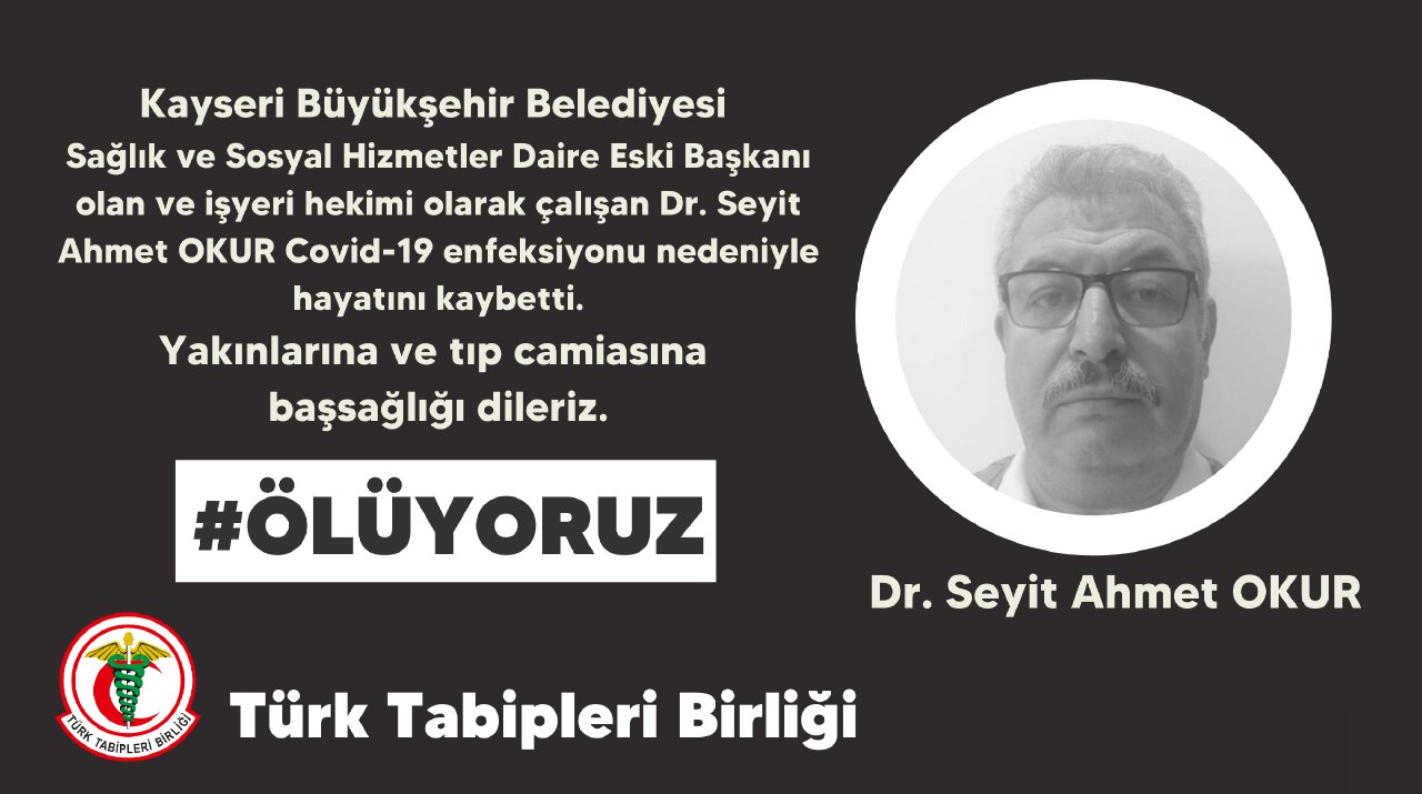 Türk Tabipleri Birliği (TTB), işyeri hekimi olarak görev yapan Dr. Seyit Ahmet Okur’un koronavirüs nedeniyle hayatını kaybettiğini duyurdu