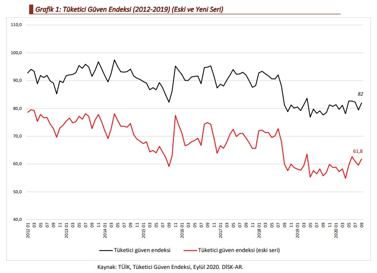 DİSK Araştırma Merkezi (DİSK-AR), Türkiye İstatistik Kurumu’nun (TÜİK) Tüketici Güven Endeksi’ni yüksek göstermek için 21 Eylül’de yöntem değişikliğine gittiğini belirterek “Tüketici güvensizliğinin yüksek olduğu iki soru endeksten çıkarıldı. Tüketici güveni ortalamanın üstünde olduğu iki soru endekse eklendi. Kötümser sonuçları olan sorular çıkarılırken iyimser sonuçları olan sorular endekse eklendi” ifadelerini kullandı.