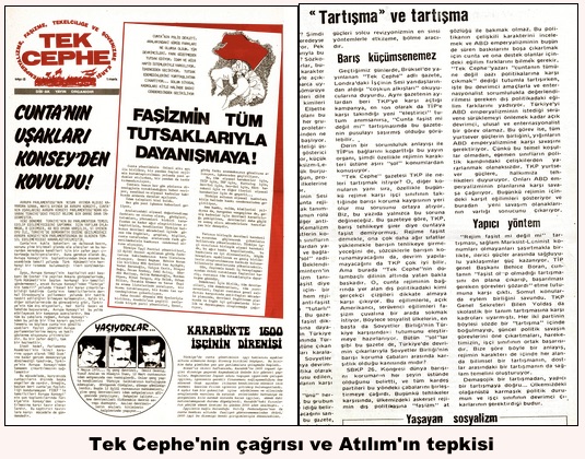 “Brüksel’de yayınlanan Tek Cephe adlı gazetenin aylardan beri TKP’ye karşı açtığı kampanya, en son olarak da TİP’e karşı takındığı ‘eleştirici’ tutum anımsanırsa, ‘Cunta faşist mi değil mi?’ tartışmasında bu gazetenin pusulayı şaşırmış olduğu görülebilir. Derin bir sorumluluk anlayışıyla TİP’in bağlarını koparttığı bu yayın organı, şimdi özellikle rejimin karakteri üstüne aşırı ‘sol’ konumlardan konuşuyor. ‘Rejim faşist mi değil mi’ tartışması, sağlam Marksist-Leninist konumları olmayanları şaşırtmakla birlikte, ilerici güçler arasında sağduyulu yaklaşımlar güç kazanıyor. TİP Genel Başkanı Behice Boran, cuntanın ‘faşist olup olmadığı tartışmasını ön plana çıkarıp başarılması gereken görevleri gözardı’ etme tutumuna karşı çıktı. Somut konularda eylem birliğini savundu.”
