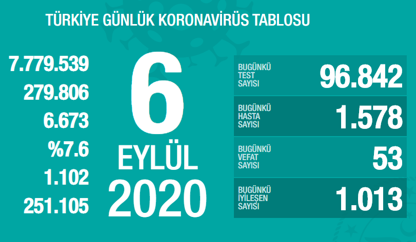 Sağlık Bakanlığı, bugün (6 Eylül) COVID-19 nedeniyle 53 hastanın daha hayatını kaybettiğini, 1578 yurttaşın da koronavirüs testinin pozitif çıktığını açıkladı. Vaka ve vefat sayılarının artış göstermesinin ardından günlük COVID-19 tablosu, 2 Eylül’den bu yana Bakan Fahrettin Koca tarafından paylaşılmıyor.