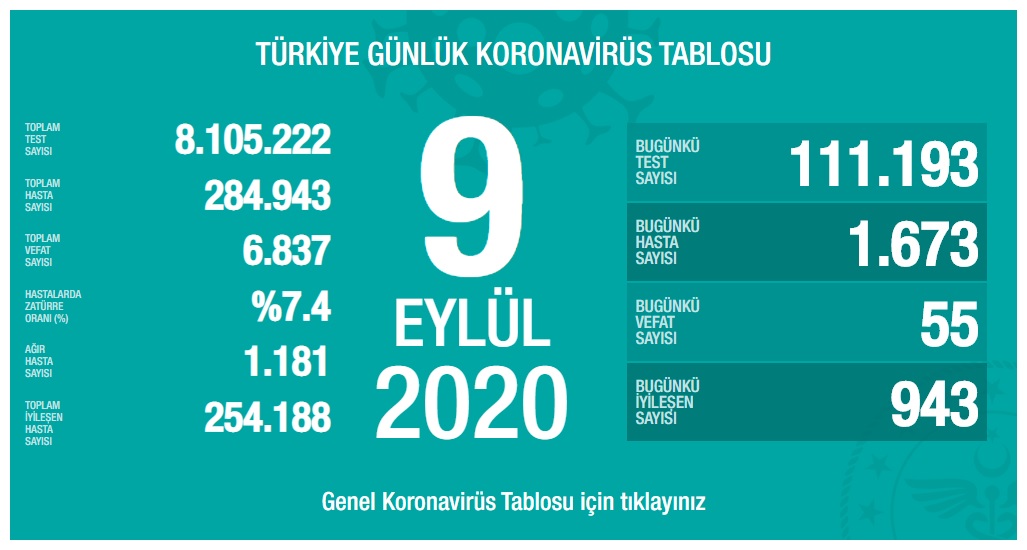 Sağlık Bakanı Fahrettin Koca, Twitter üzerinden yaptığı açıklamada “Toplamda 8 milyondan fazla test yapıldı. Bugün ise 110.000’den fazla yapılan test sonucunda 1.673 yeni tanı konmuş hastamız var. Tedbirlere hepimiz destek verirsek virüse karşı daha güçlü olacağız. Bu güce destek verin, sevdiklerimizi koruyalım” dedi.
