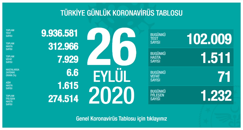 Sağlık Bakanlığı, bugün (26 Eylül) COVID-19 nedeniyle 71 hastanın daha hayatını kaybettiğini, 1511 yurttaşın da koronavirüs testinin pozitif çıktığını açıkladı. Vaka ve vefat sayılarının artış göstermesinin ardından günlük COVID-19 tablosu, 2 Eylül’den bu yana Sağlık Bakanı Fahrettin Koca tarafından paylaşılmıyor.