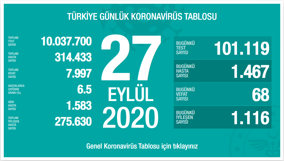 Sağlık Bakanlığı, bugün (27 Eylül) COVID-19 nedeniyle 68 hastanın daha hayatını kaybettiğini, 1467 yurttaşın da koronavirüs testinin pozitif çıktığını açıkladı. Vaka ve vefat sayılarının artış göstermesinin ardından günlük COVID-19 tablosu, 2 Eylül’den bu yana Sağlık Bakanı Fahrettin Koca tarafından paylaşılmıyor.