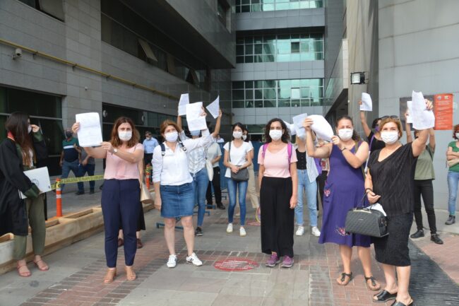 Basın metni okunduktan sonra hakkında idari para cezası uygulanan KHK’li Akademisyen Esra Ergüzeloğlu da yaptığı konuşmada, “İstanbul Sözleşmesi’nin gerekliliğini vurguladığımız için biz kadınlara toplamda yaklaşık 70 bin TL idari para cezaları uygulandı. Bizler bu cezaların anlamını biliyoruz. Bizleri sokaklardan çekmek evlerimize kapatmak istiyorlar. Biz bu tutuma sonuna kadar karşı çıkacağız. Kadın mücadelesine herkesin katkılarını bekliyoruz” dedi.