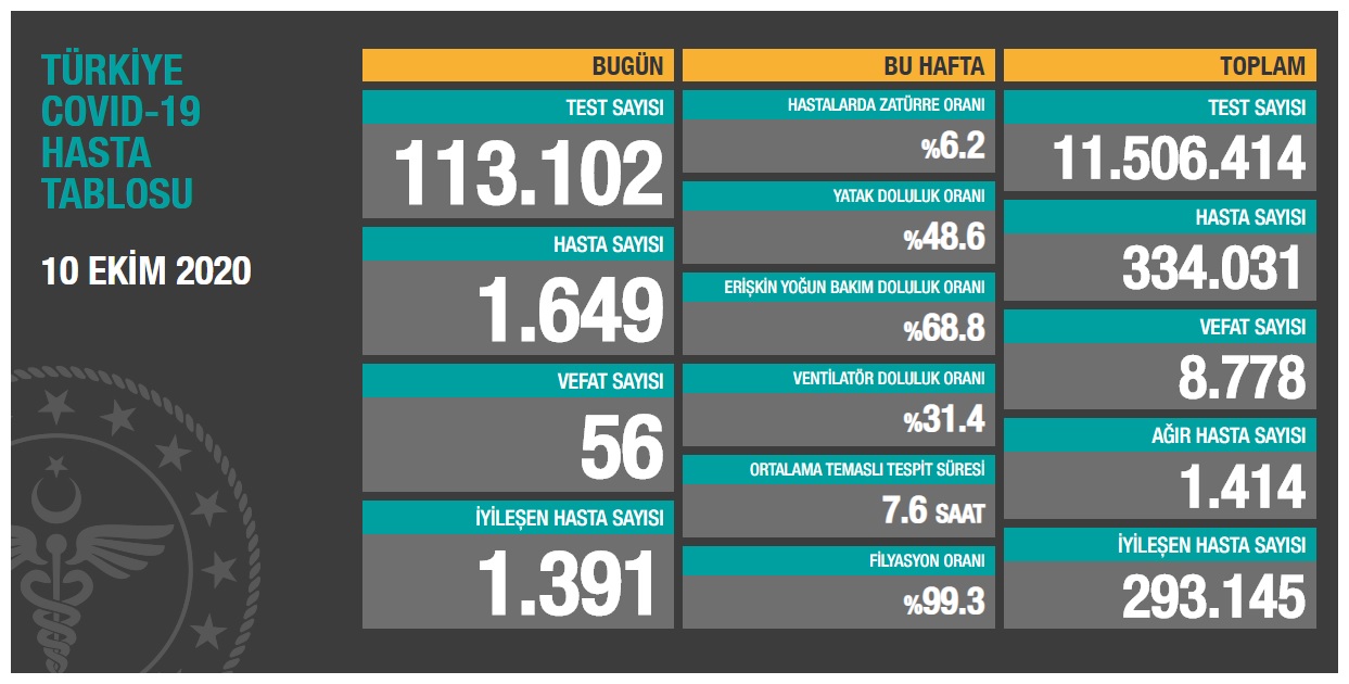 Sağlık Bakanlığı, bugün (10 Ekim) COVID-19 nedeniyle 56 hastanın daha hayatını kaybettiğini, yeni hasta sayısının ise 1649 olduğunu açıkladı.