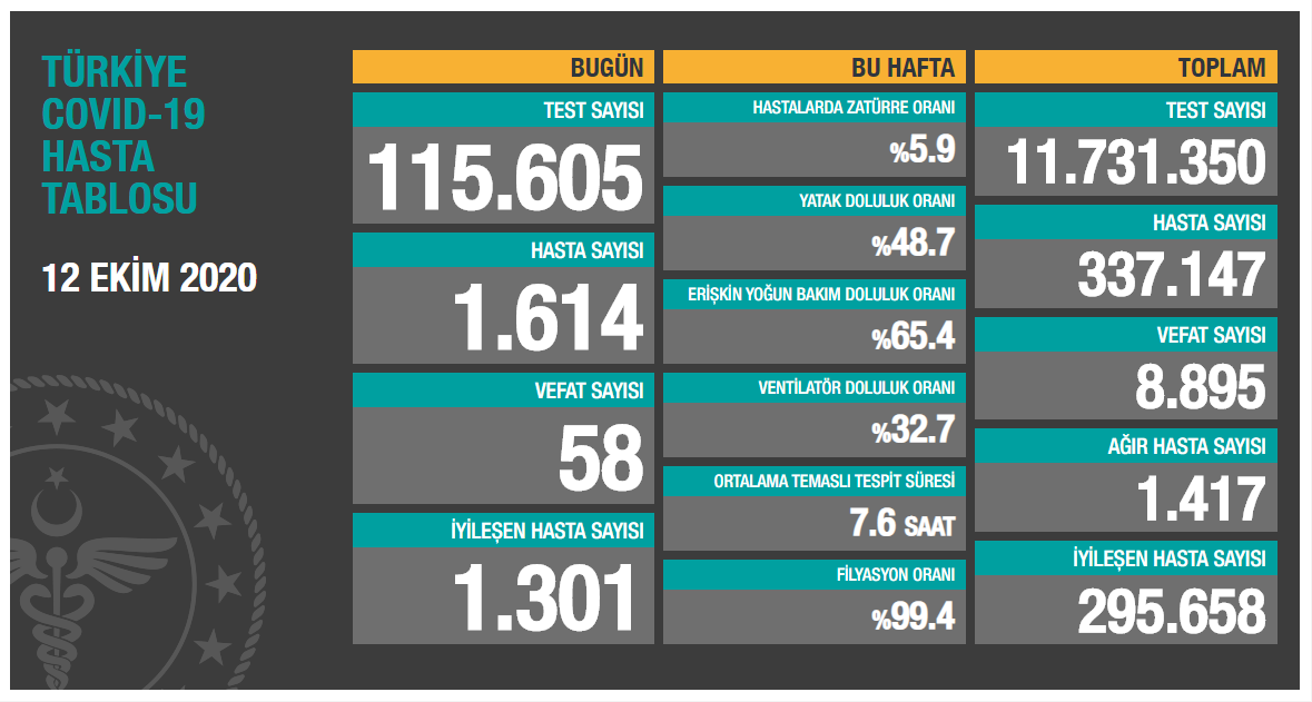 Sağlık Bakanlığı, bugün (12 Ekim) COVID-19 nedeniyle 58 hastanın daha hayatını kaybettiğini, yeni hasta sayısının ise 1614 olduğunu açıkladı.