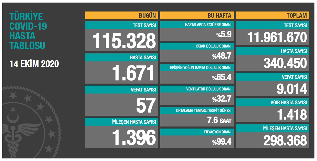 COVID-19 nedeniyle 57 hasta daha hayatını kaybederken, hasta sayısı 1671 olarak açıklandı. Bakan Koca 30 Eylül’de, belirti göstermeyen ama testi pozitif çıkan vakaların tabloda yer almadığını açıklamıştı