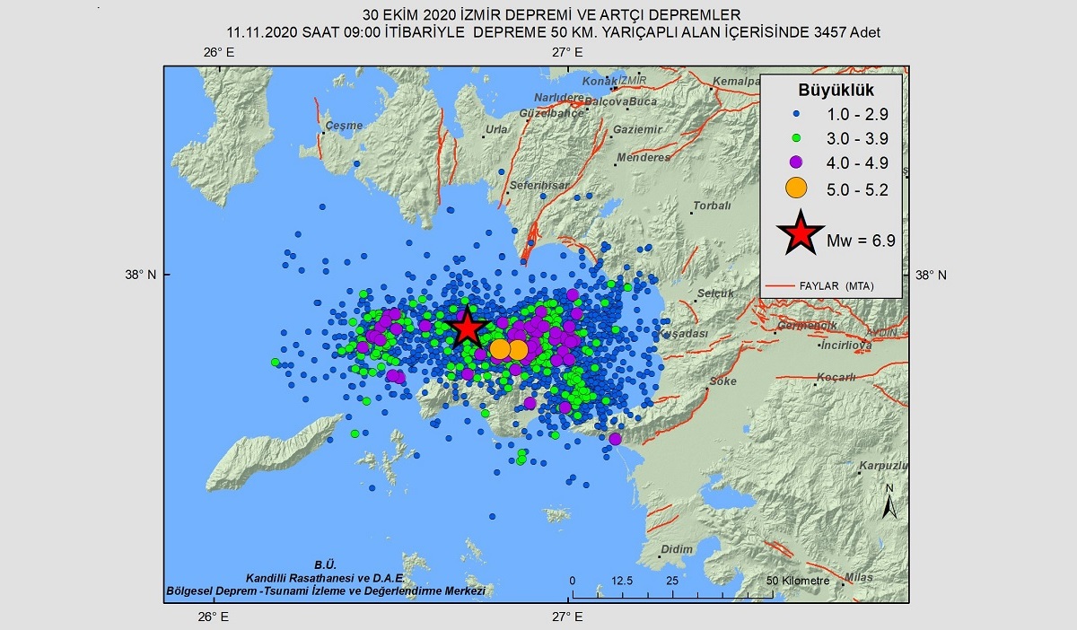 30 Ekim 2020 saat 14:51’de Ege Denizi’nde Sisam adasının kuzeyi ile Doğanbey meydana gelen Mw=6.9 büyüklüğündeki depremin ardından 11 Kasım 2020 saat 09:00 itibarıyla bölgede 3457 artçı deprem çözümü yapılmıştır. Bunlardan 58 tanesi M =4.0 ve daha büyüktür. pic.twitter.com/ib1DLt7Idy