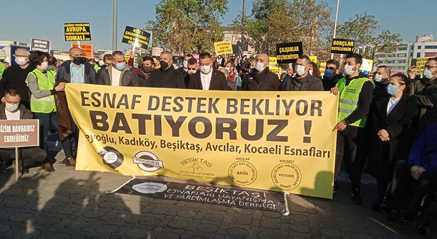 “Esnaf destek bekliyor: Batıyoruz!” yazılı pankartın açıldığı eylemde, “Müzisyenim açım”, “Açız! Çalamıyoruz!”, “Kira desteği istiyoruz”, “Çalışanlar geçinemiyor”, “Garsonuz, çalışamıyoruz”, “Esnafın kirasını ertele”, “Mahallenin gönüllü bekçileri tekel bayileri” dövizleri taşındı.