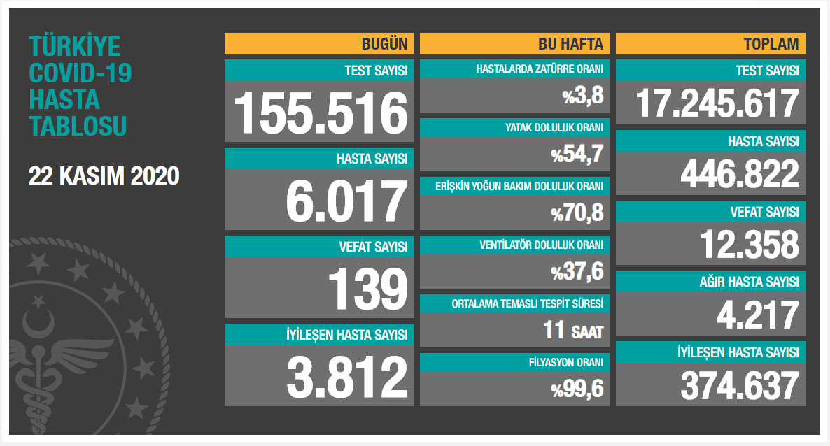 Sağlık Bakanlığı, bugün (22 Kasım) COVID-19 nedeniyle 139 hastanın daha hayatını kaybettiğini, yeni hasta sayısının ise 6017 olduğunu açıkladı.