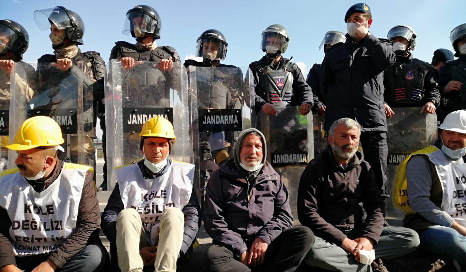 Madencilerin yürüyüşünü engelleyen jandarma, yol üzerinde oturmak isteyen madencileri gözaltına almak istedi. Jandarmaya direnen madenciler, ablukaya alındı.