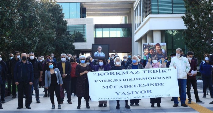 10 Ekim Emek, Barış, Demokrasi mitinginde Ankara Garı önündeki katliamda hayatını kaybeden Korkmaz Tedik’in isminin Konyaaltı Belediyesi’nde bir parka verilmesine karşı imza kampanyası başlatan AKP ve MHP, Antalya Emek ve Demokrasi Güçleri tarafından protesto edildi.