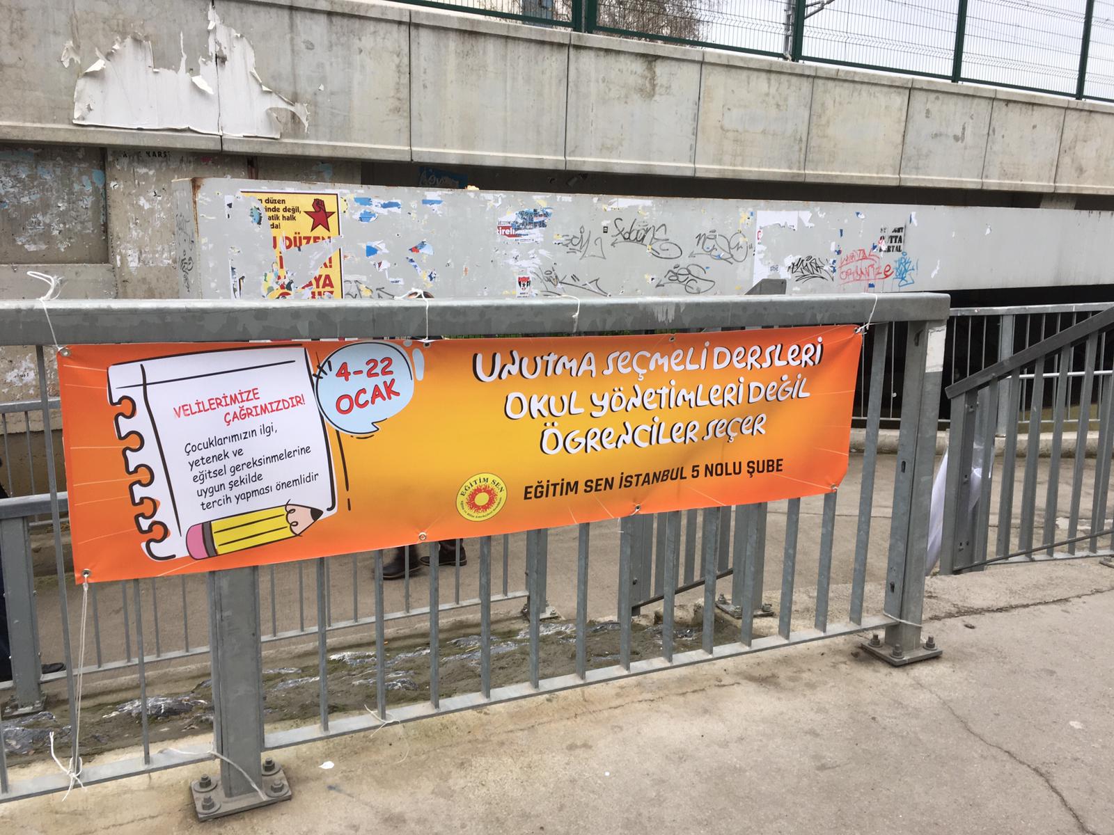 Eğitim Sen İstanbul 5 Nolu Şube yöneticileri “Seçmeli dersleri okul yönetimleri değil öğrenciler seçer” afişi asarken karakola götürülerek Kabahatler Kanunu’na göre para cezası kesildi
