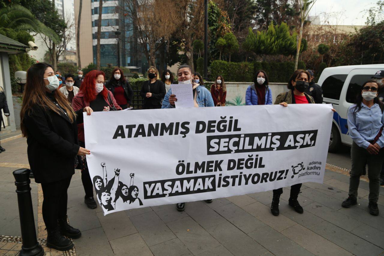 Adana’da kadınlar Adana Kadın Platformu çağrısı ile saat 12.30’da Düş Yolcuları Parkı’nda basın açıklaması yaptı. Açıklamayı Üniversiteli Kadın Kolektifi’nden Ayşe Bezeğiş okudu. Açıklama devam ettiği sırada polis, sık sık anons yaparak, açıklamaya katılanlar hakkında adli ve idari işleme başlatılacağını söyledi.