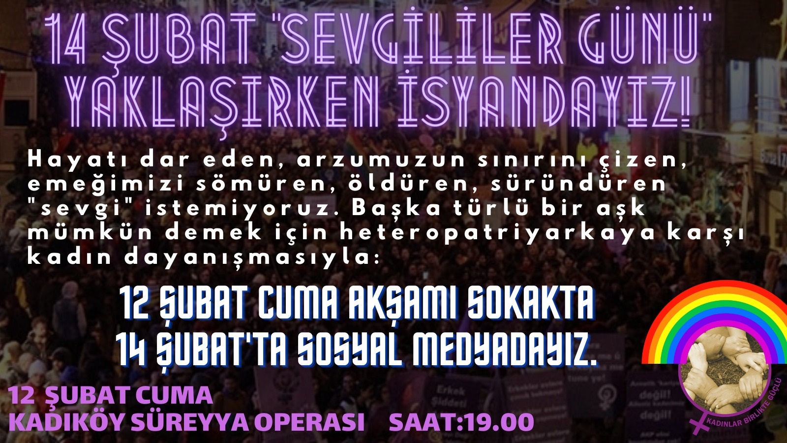 Kadınlar Birlikte Güçlü, “Eşitsizlik, erkek şiddeti ve pandemiyle artan emek sömürüsünün ‘sevgi’ adıyla doğallaştırılmasından, evlilik odaklı heteroseksüel ilişki dışında her aşk ve bedenin hedef gösterilmesinden bıkmadık mı?” diyerek İstanbul’da tüm kadınları 12 Şubat’ta sokağa, 14 Şubat’ta sosyal medya eylemine çağırıyor.