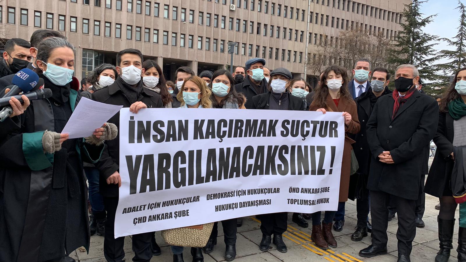 Ankara’da üç üniversite öğrencisinin evlerinin önlerinden polis olduklarını söyleyen şahıslar tarafından kaçırılıp darp ve tehdit edildikten sonra üç farklı noktada bırakılması üzerine harekete geçen hukuk örgütleri Ankara Adliyesi’ne giderek suç duyurusunda bulundu. Suç duyurusu öncesinde adliye önünde yaptıkları açıklamada “Fail hakkında doğrudan soruşturma ve kovuşturma yürütmek zorundasınız” diyerek Ankara Cumhuriyet Başsavcılığı’na seslenen avukatlar bu yapılmadığı sürece Ankara’da hiçbir yurttaşın güvende olmayacağını söyledi