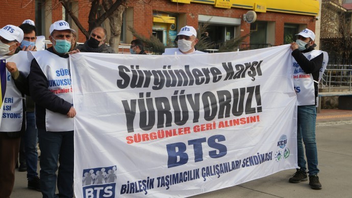 Birleşik Taşımacılık Sendikası, İzmir’de sendika üye ve yöneticilerinin sürgün edilmesini protesto etti. Alsancak semtinde bulunan TCDD 3’üncü Bölge Müdürlüğü önünde yapılan açıklamaya Kamu Emekçileri Sendikaları Konfederasyonu (KESK) Eş Genel Başkanı Aysun Gezen ve Haber-Genel Başkanı Mesut Balcan katıldı. “İhraç Sürgün ve Baskılara Karşı Yürüyoruz”, “Baskılar bizi Yıldıramaz” ve “Birleşe, Birleşe Kazanacağız” sloganların atıldığı açıklamayı BTS Şube başkanı Erdal Akyol okudu.
