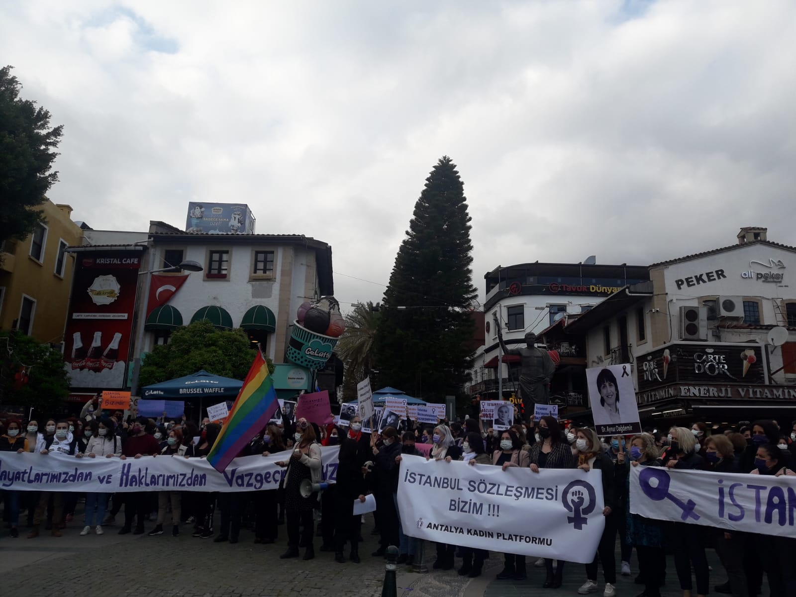Antalya Feminist Kolektif adına konuşan Avukat Aylin Onursev, sözleşmenin toplumsal bellekte erkek lehine örülmüş tüm eşitsizliklerin, cinsiyet kalıp yargılarının giderilebilmesini sağlayacak en önemli hukuksal güvencelerden biri olduğunu belirtti. İktidarın toplumsal cinsiyetten kaynaklanan eşitsizliklerden de güç aldığını dile getiren Onursev, “Bu nedenle Cumhurbaşkanlığı kararı hukuken hükümsüzdür, sözleşme halen yürürlüktedir. Bu karar Anayasa’ya ve uluslararası insan hakları hukukuna aykırıdır. Karar, Anayasa’nın başlangıç ilkelerinin, değiştirilemez hükümlerinin ve Türkiye’nin imzacısı olduğu temel hak ve özgürlüklere ilişkin uluslararası düzenlemelerin ihlalidir. Şimdiye kadar seçme ve seçilme hakkını elde etmek de dâhil olmak üzere tüm kazanımlarımızı (mirastan pay alma, doğurganlığa, doğum kontrolüne dair haklar ve daha birçok hak) nasıl mücadele ederek elde ettiysek burada da aynı mücadele ve dayanışmayı göstererek geri adım atmayacağız, kazanımlarımızı kaybetmeyeceğiz, buradayız bir yere gitmiyoruz” ifadelerini kullandı.