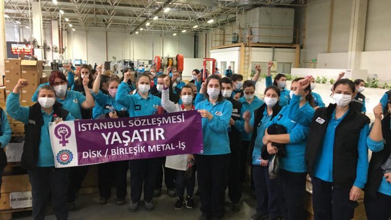 Birleşik Metal-İş Sendikası’na üye kadın işçiler İstanbul Sözleşmesi’nden çekilme kararının ardından, işyerlerinde yaptıkları eylem ve etkinliklerle kararı protesto ettiler. Merkez ve şube binalarına asılan “İstanbul Sözleşmesi yaşatır” yazılı dev pankartlarla, sendika yönetimi de sözleşmeye sahip çıkarak, protesto eylemlerine destek verdi
