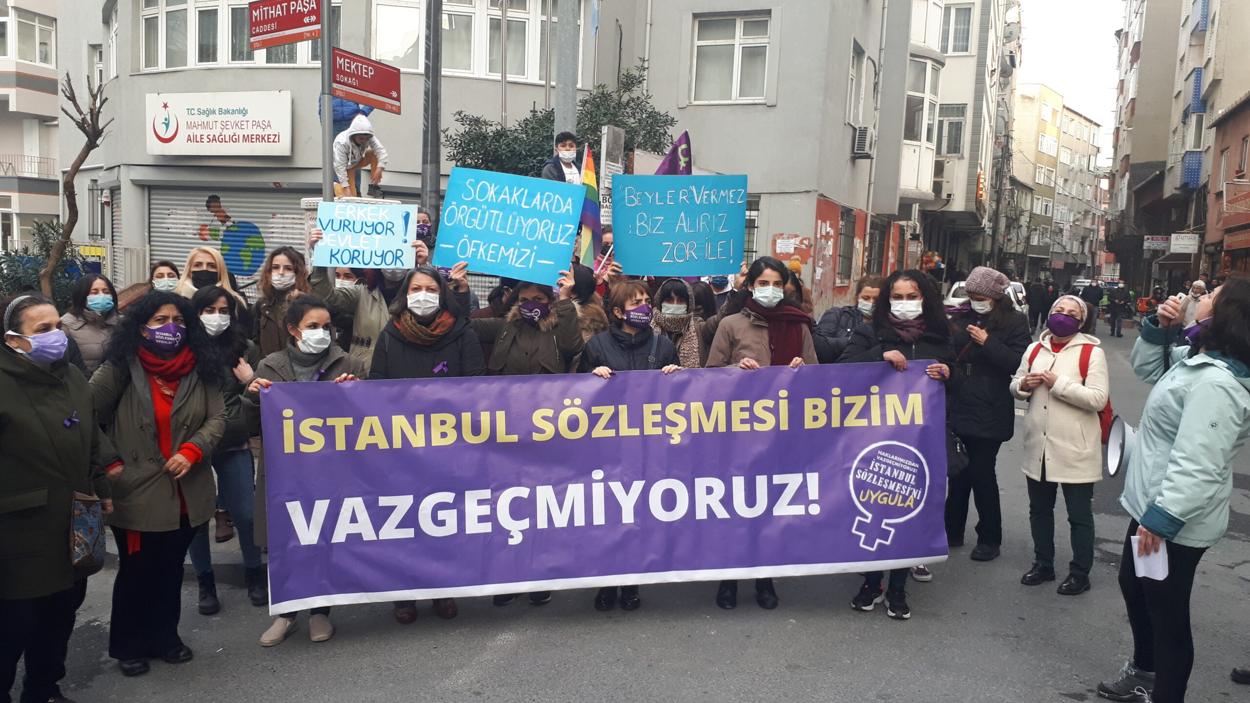 Kadınlar saat 18.30’da Mahmut Şevket Paşa Mahallesi Sağlık Ocağı önünde buluştu. Çok sayıda polis ve polis aracı kadınların eylemi boyunca bekledi. Özel harekatın da beklediği eylemde kadınlar “Kadın cinayetleri politiktir”, “Susmuyoruz, korkmuyoruz, itaat etmiyoruz”, “Kadınları değil erkek şiddetini engelle” ve “Kadınlar birlikte, birlikte güçlü” sloganlarıyla bekledi. Ellerinde “İstanbul Sözleşmesi bizim, vazgeçmiyoruz” yazılı pankart taşıyan kadınlar İstanbul Sözleşmesi’nin feshedilmesinin hukuksuzluk olduğunu dile getirdi. “Bizleri değil şiddet faillerini durdurun” diyerek ses çıkardılar. “İstanbul Sözleşmesi’nden vazgeçmiyoruz” diyen kadınlar “Dünyayı yerinden oynatacağız” sloganı attı. Ardından “Niyetimiz yok” diyerek “Hayır, hayır demektir” ve “Bağır herkes duysun, erkek şiddeti son bulsun” sloganlarını attılar. Kadınlar eylemde “Beyler vermez, biz alırız zor ile” ve “Sokaklarda örgütlüyoruz öfkemizi” yazılı dövizler tuttular.