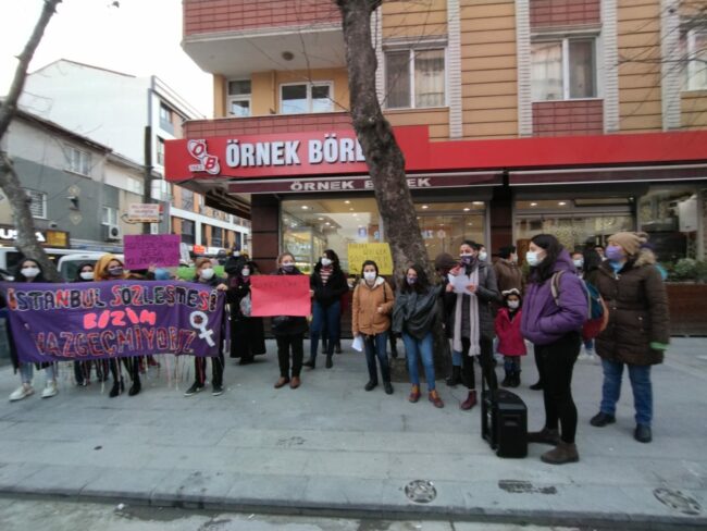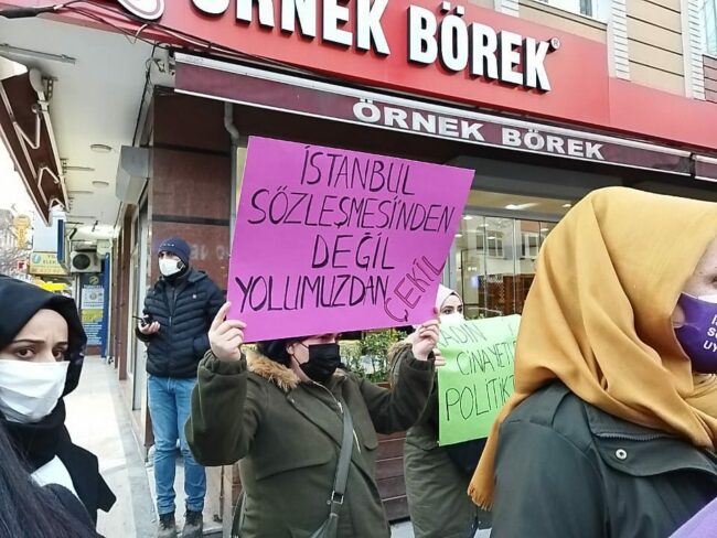 Kadınlar saat 18.30’da Esenyurt Depo’da Kapalı Cadde’deki Örnek Börek önünde bir araya geldi. Kadınlar ellerinde “İstanbul Sözleşmesi bizim. Vazgeçmiyoruz” yazılı pankart taşıdı.