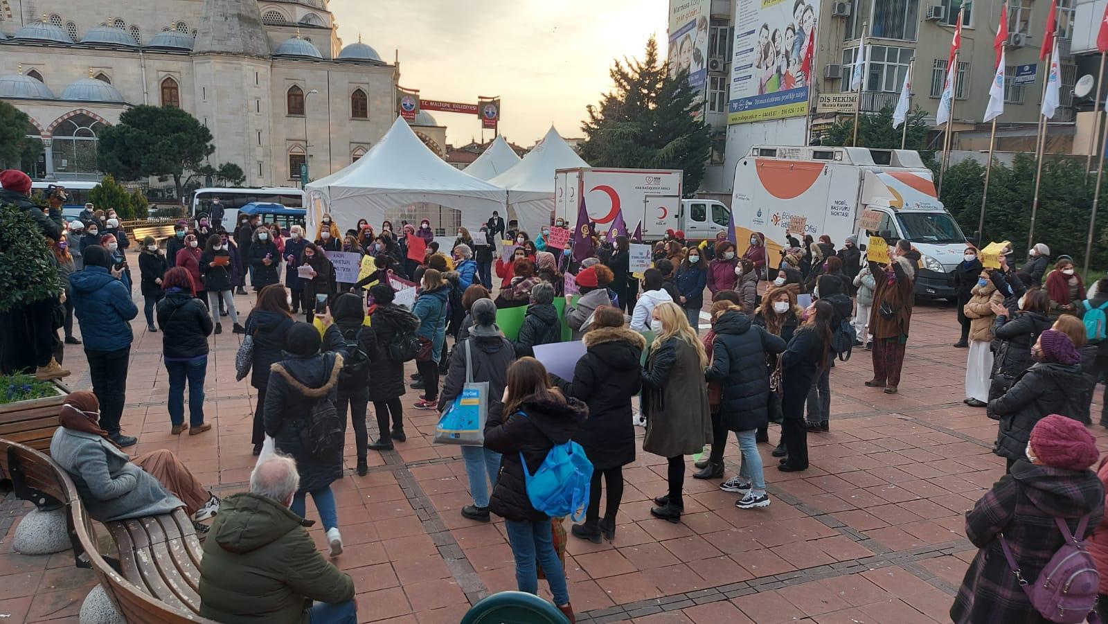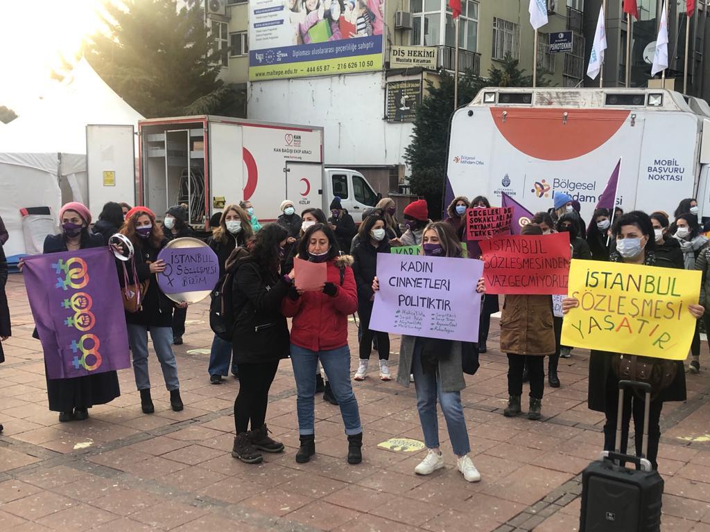 Kadınlar saat 18.30’da Maltepe Meydanı’nda bir araya geldi. Kadınlar ellerinde, “İstanbul Sözleşmesi bizim. Vazgeçmiyoruz” yazılı pankartı taşıdı.