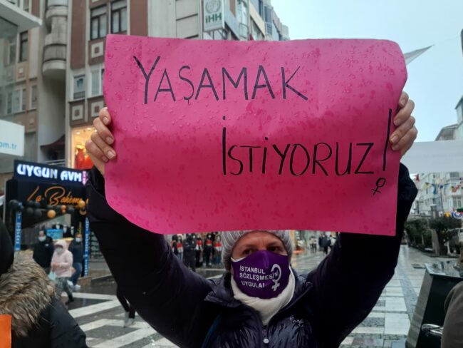 Tüm kadınların özgür ve korkusuzca yaşamaları sağlanmadan böyle bir yaşamın olanaklarını yaratacak olan hiçbir sözleşme, yasa, uygulamadan el çekmiyoruz! Hayatlarımıza dair kararları biz alırız! Hayatlarımızın ve haklarımızın tek bir adamın kararına, kararnamesine bağlı olmasına izin vermiyoruz Haklarımızı elimizden almanıza, bizleri şiddete ve öldürülmeye mahkûm etmenize izin vermeyeceğiz. Sözleşmeden vazgeçmiyoruz!
