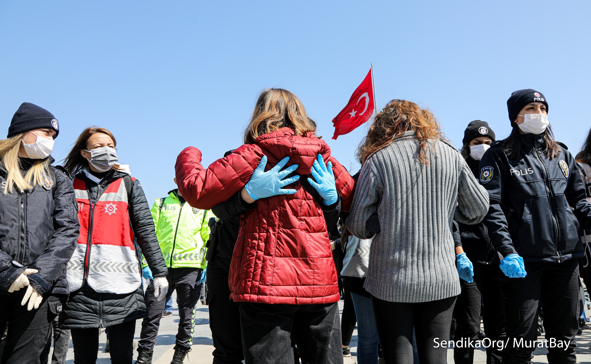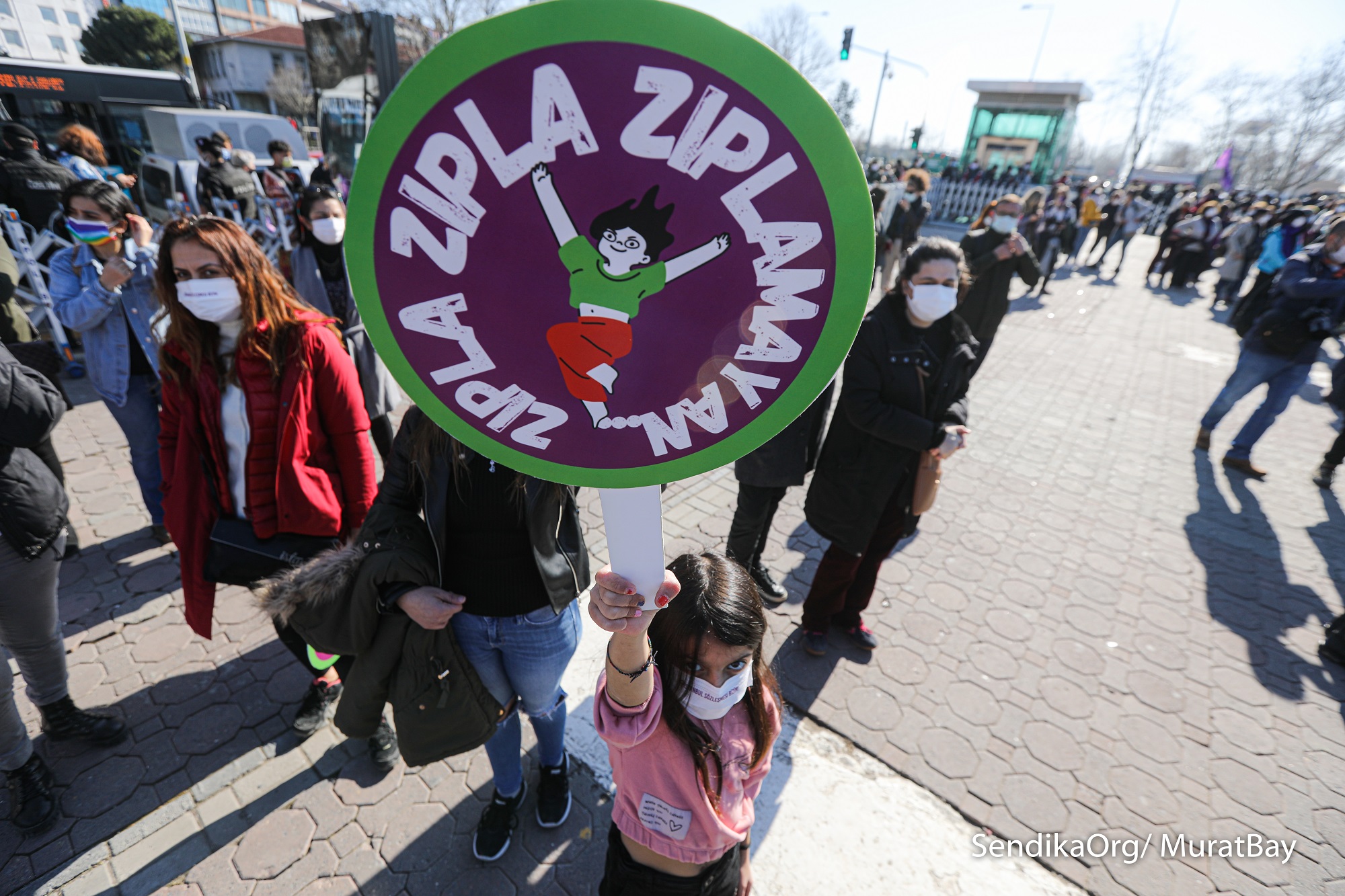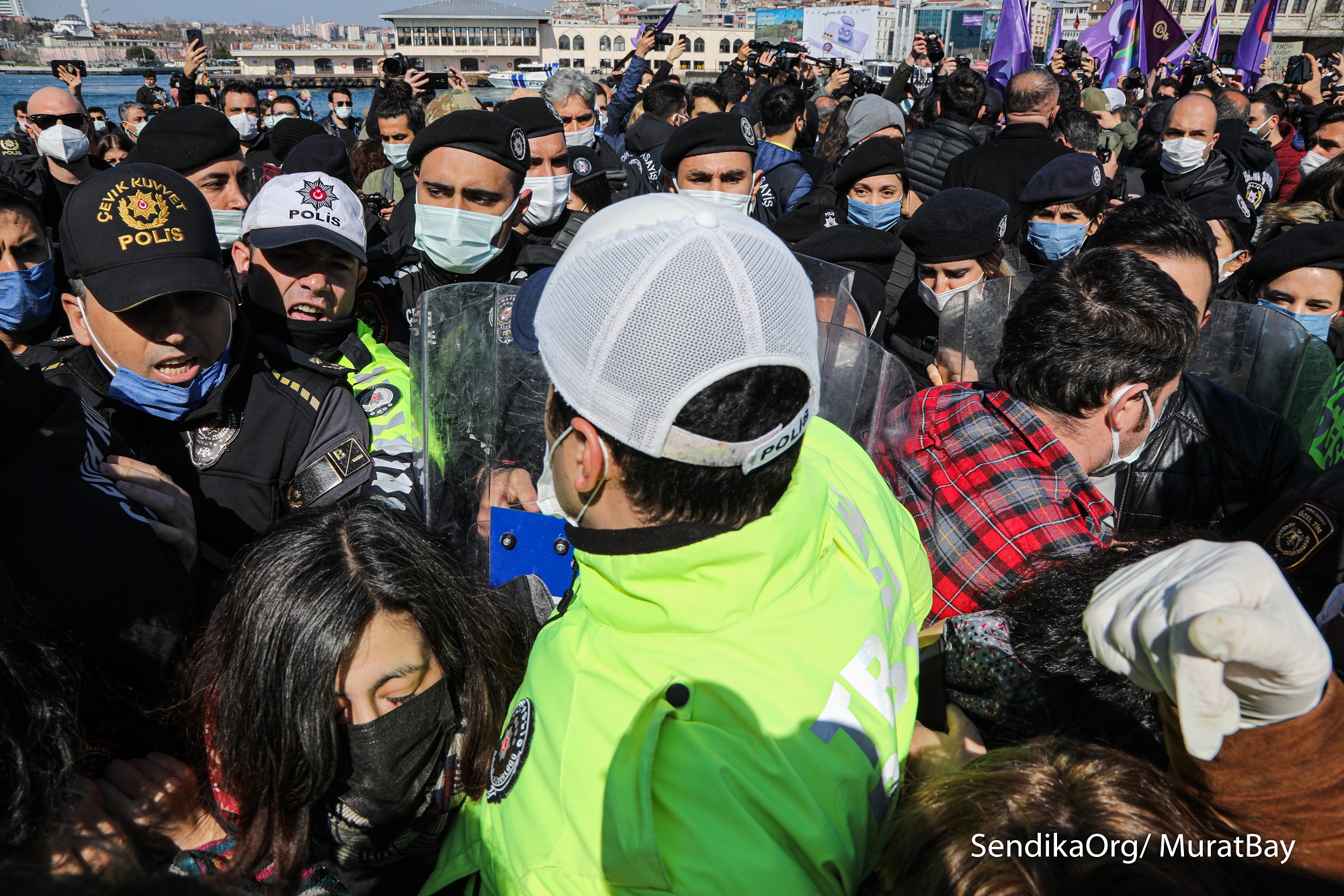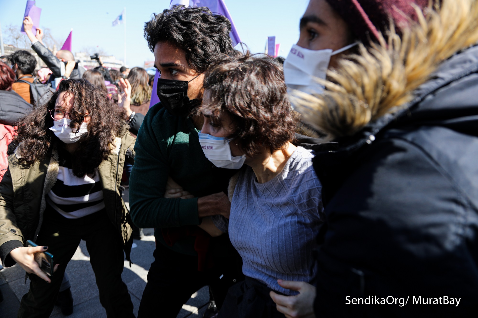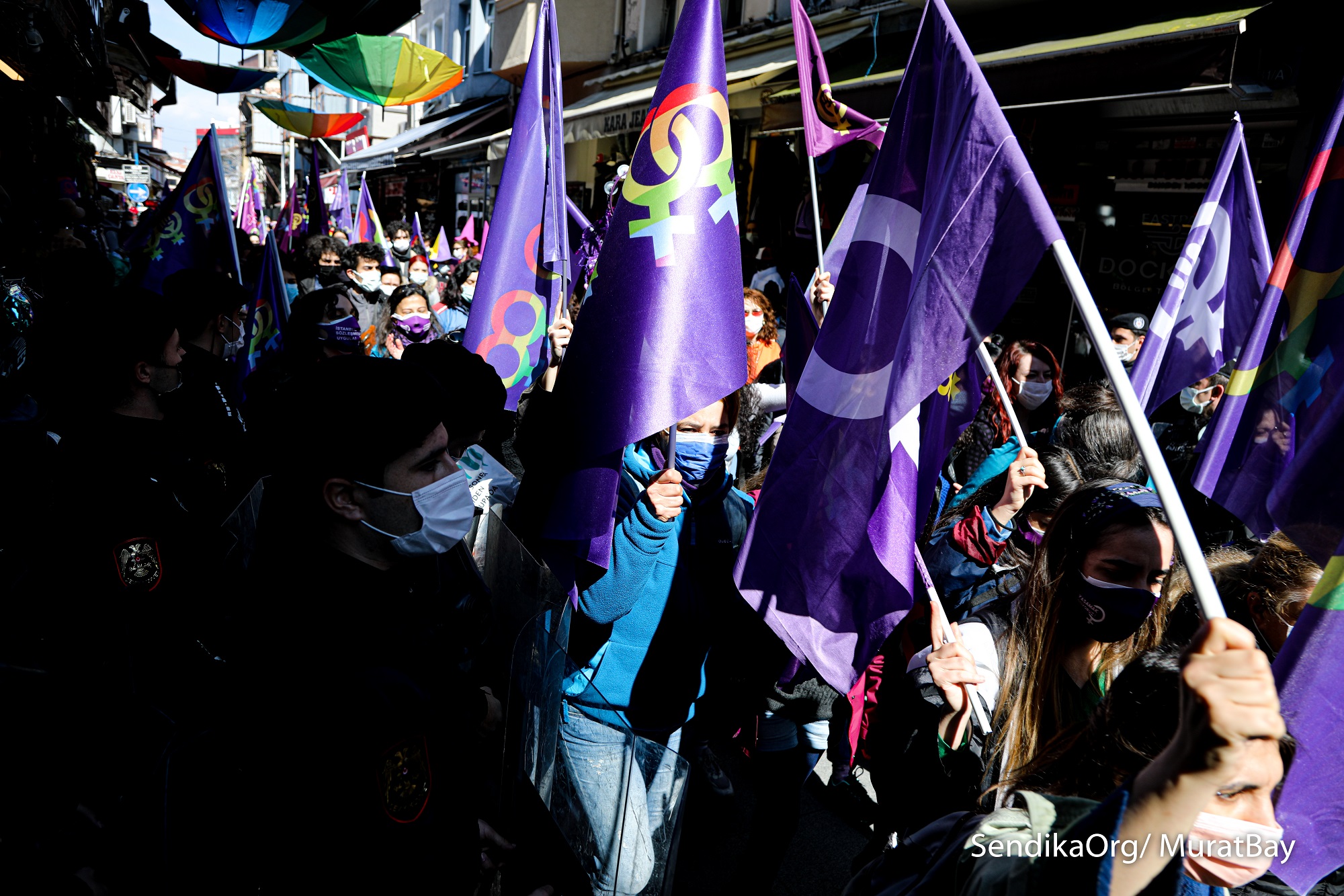 “Yasalar sokakta yazılır” diyen kadınlar, Türkiye’nin Erdoğan eliyle İstanbul Sözleşmesi’nden çıkarılmasına karşı dün (27 Mart) bir kez daha Kadıköy sokaklarını doldurdu. Polisin engellemelerine rağmen ne gökkuşağı bayraklarından ne ses sisteminden taviz veren kadınlar, barikatları yıkıp geçti. Eylemi yerinden takip eden Sendika.Org muhabiri Murat Bay’ın objektifinden “İstanbul Sözleşmesi bizim” isyanı