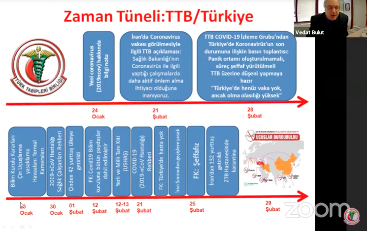 TTB Genel Sekreteri Prof. Dr. Vedat Bulut, dünyada ve Türkiye’de bir yıllık zaman zarfında yaşananları içeren “Zaman Tüneli” sunumunu yaptı.