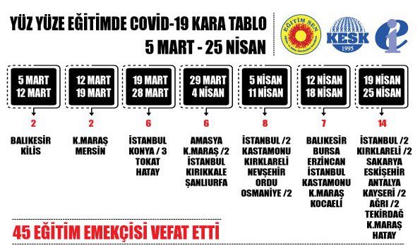 Eğitim ve Bilim Emekçileri Sendikası (Eğitim Sen) haftalık COVID-19 raporunu yayımladı. Rapora göre 14’ü 19 Nisan haftasında olmak üzere 5 Mart’tan bu yana toplam 45 eğitim emekçisi yaşamını yitirdi