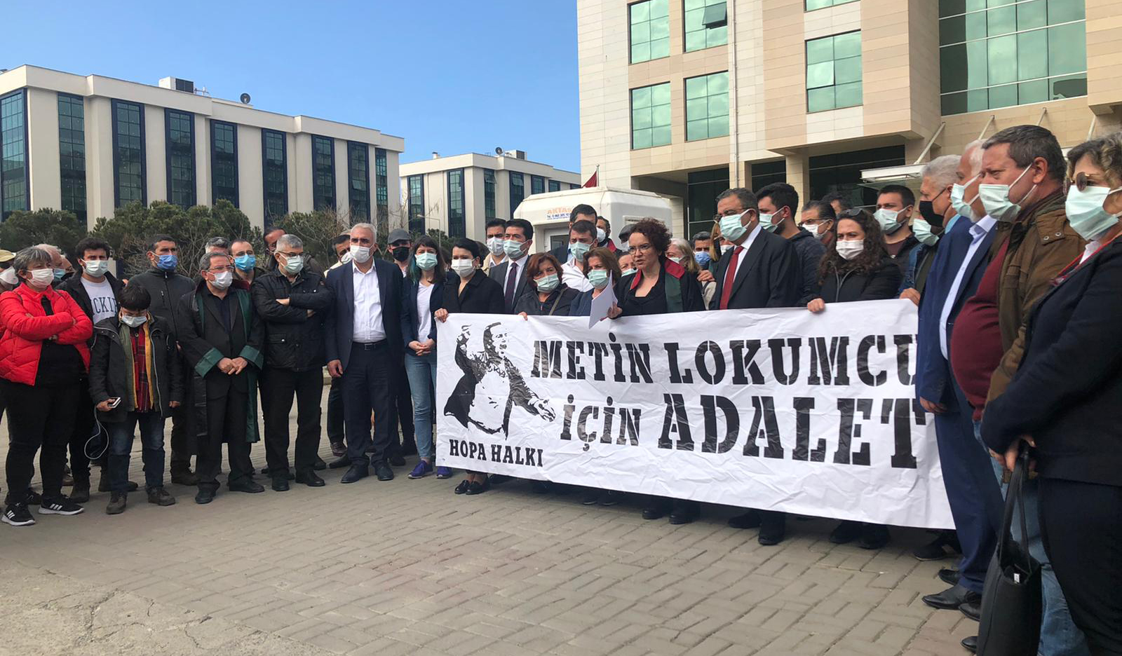 Duruşmanın tamamlanmasının ardından avukatlar, “Metin Lokumcu için adalet” pankartının önünde açıklamada bulundu.