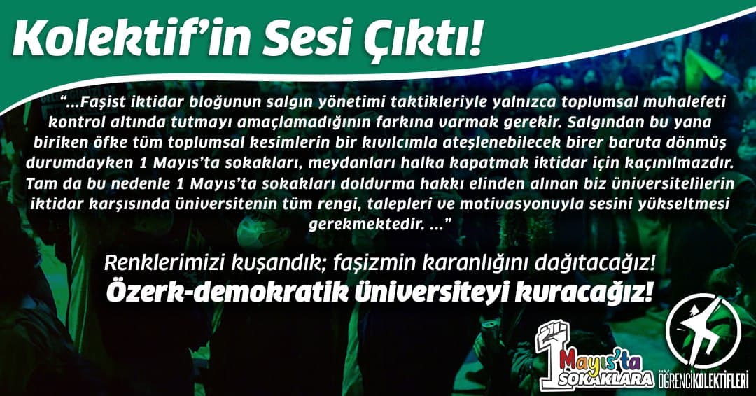 Ne salgın adı altında bizleri yönetmeye, susturmaya çalışan Saray’ın ne de Saray soytarılarının zırvalıklarının 1 Mayıs’ı yasaklı gün ilan etmesini kabul etmiyoruz. Tüm üniversitelileri ve halkı 1 Mayıs’ta sokağa çağırıyor, mücadele etmekten vazgeçmiyoruz!
