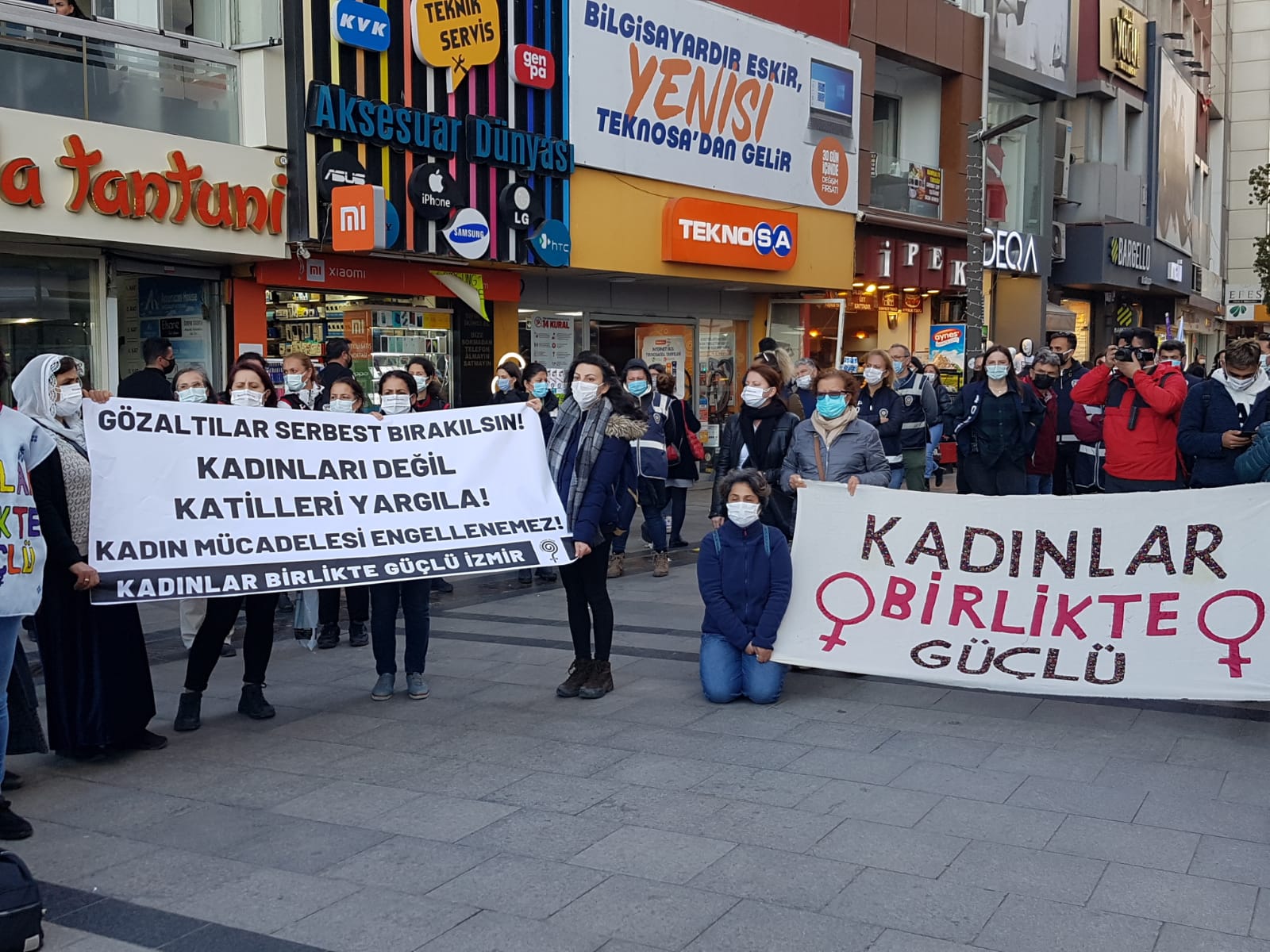 Kadınlar İzmir Karşıyaka’da Kadınlar Birlikte Güçlü’nün çağrısıyla Rosa Kadın Derneği’ne yönelik saldırılara ve gözaltılara tepki göstermek için bir araya geldi. “Kadın mücadelesini engellemeye gücünüz yetmez!” diyen kadınlar gözaltıların serbest bırakılmasını talep ederek, Rosa Kadın Derneği’nin yanında olduklarını söyledi.
