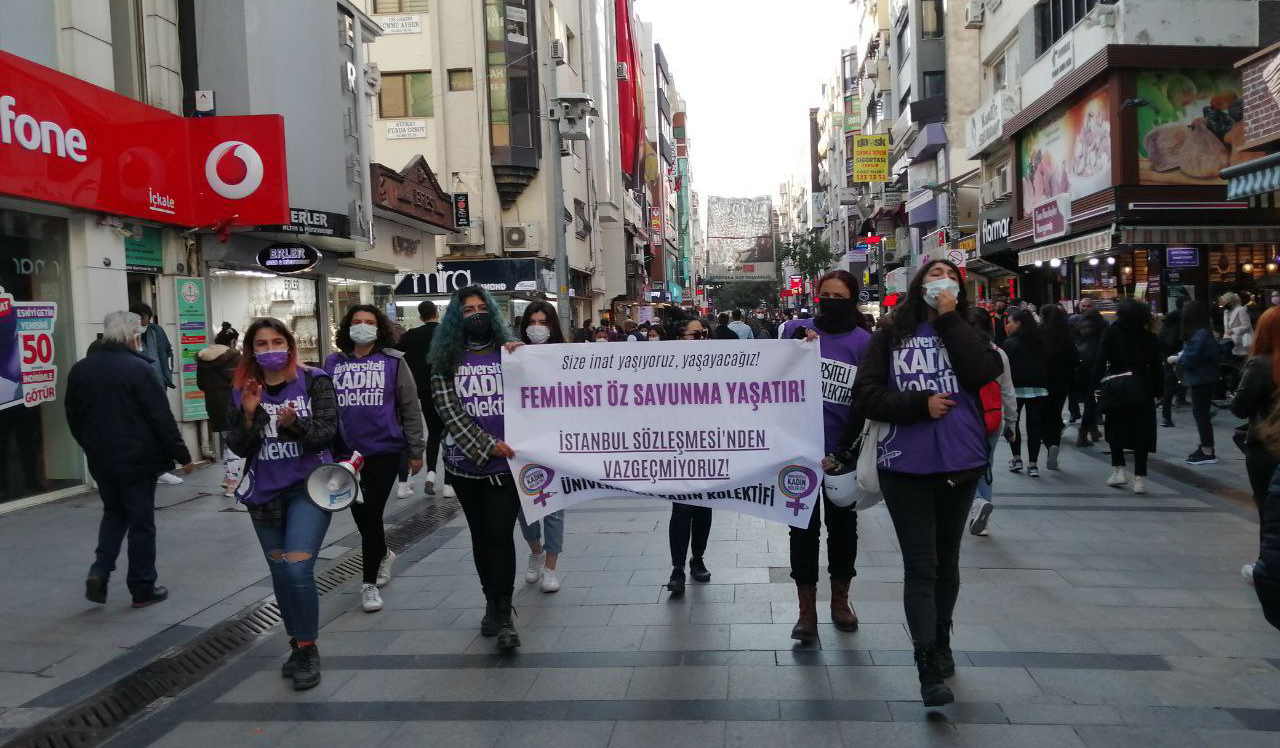 Bugün Karşıyaka Çarşı’da üniversiteli kadınlar ve LGBTİQ+’lar olarak, ölüm siyasetinize karşı yaşamlarımızı, haklarımızı savunmak için sokaktaydık.#6284Uygulanacak#İstanbulsözleşmesindenvazgeçmiyoruz#12nisan#turkeyisnotsafeforwomen pic.twitter.com/R8Zqg4a5bs— İzmir Üniversiteli Kadın Kolektifi (@izmirukk) April 12, 2021