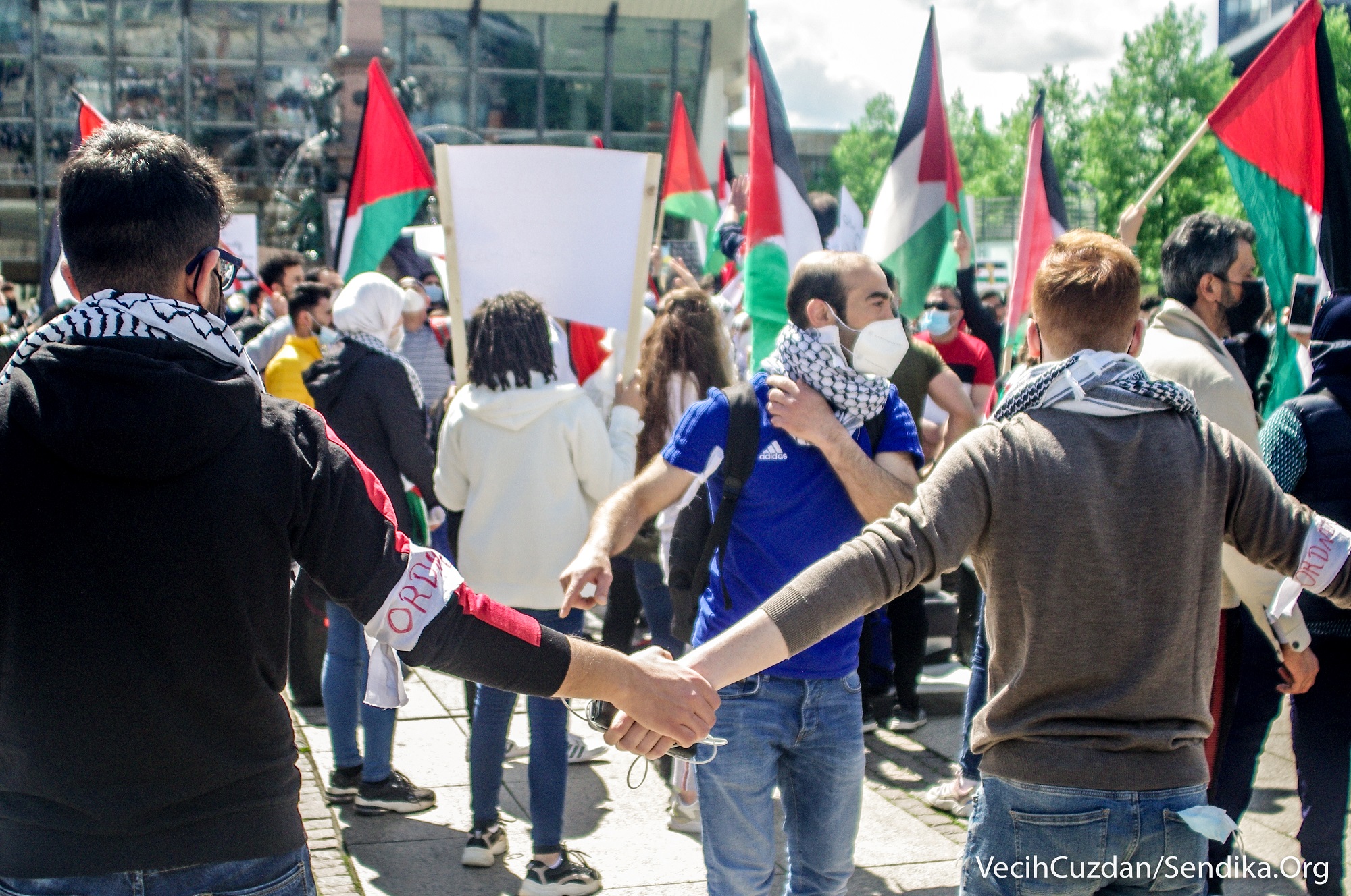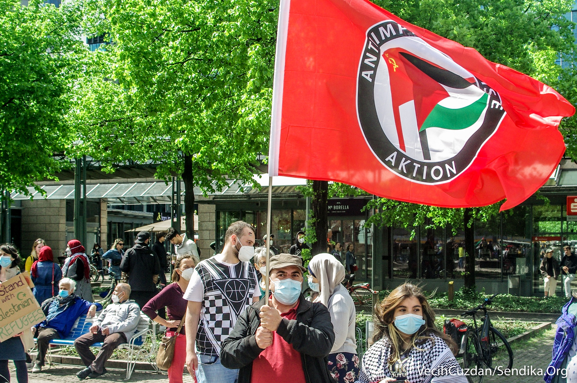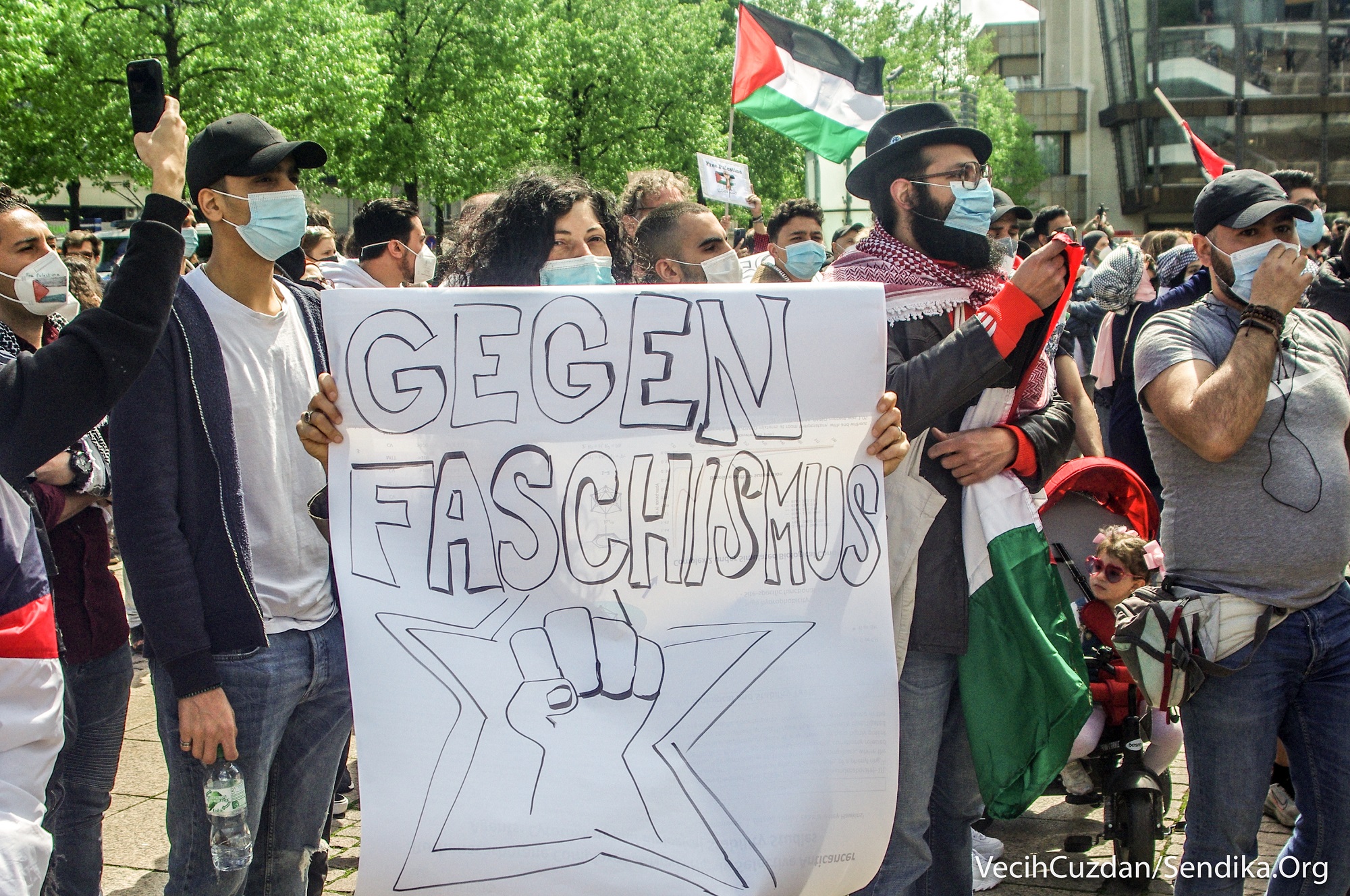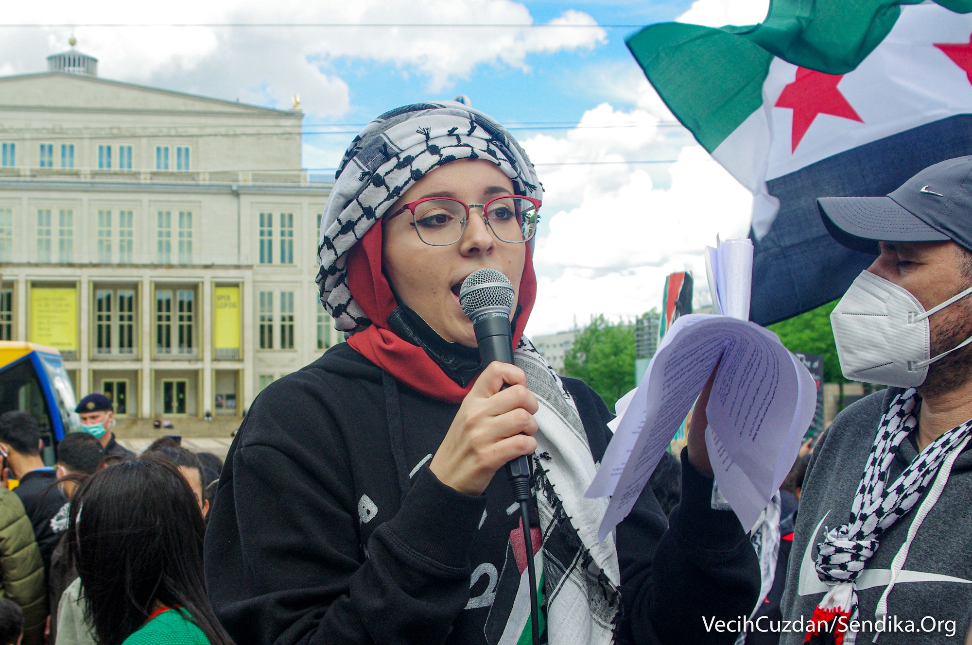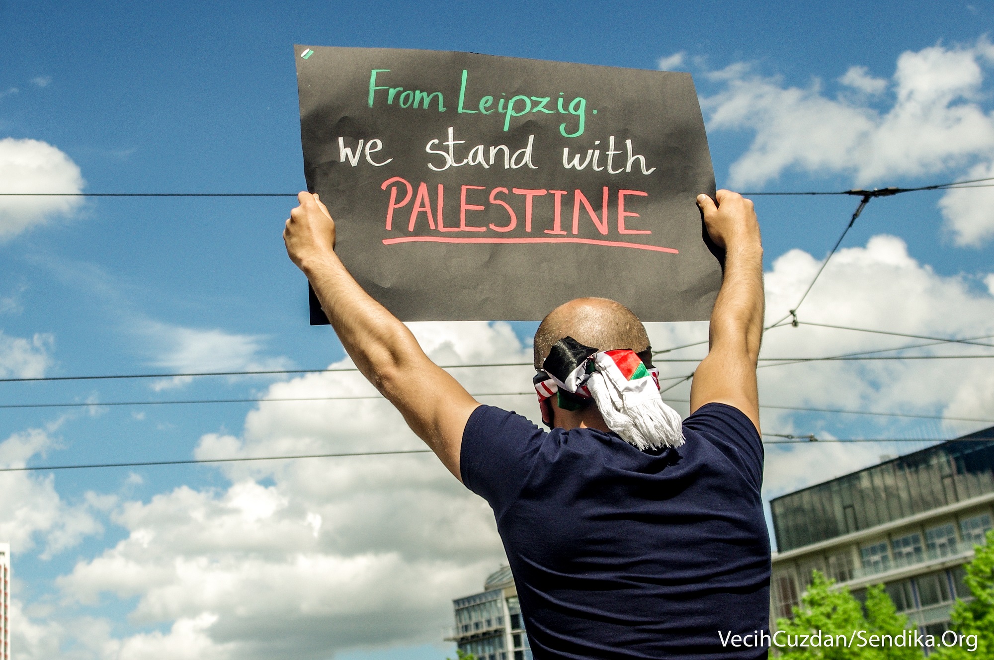 Arap ve Yahudi gençlerin çağrısıyla Augustusplatz Meydanı’ndan bir araya gelen yüzlerce kişi “1948’den beri nefes alamıyoruz”, “Leipzig’den… Filistin’in yanındayız”, “Nakba sürüyor”, “Şeyh Cerrar’ı kurtar”, “Kimin tarafındasın?”, “Siyonist devlet Yahudileri ve Yahudiliği temsil etmiyor… Özgür Filistin”, “Gazze’yi savunmak için Müslüman olmanıza gerek yok, sadece insan olman gerekiyor” yazılı dövizler taşıdı ve sık sık “Özgür Filistin”, “İşgale hayır”, “Enternasyonal dayanışmayı yükselt!”, “Hepimiz faşizme karşıyız” sloganları attı.