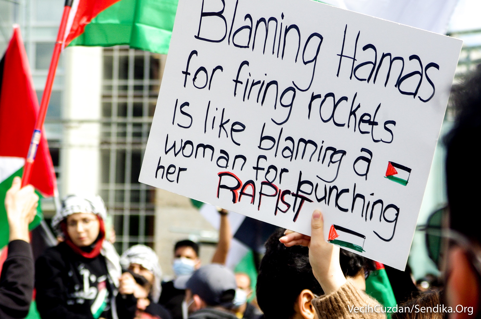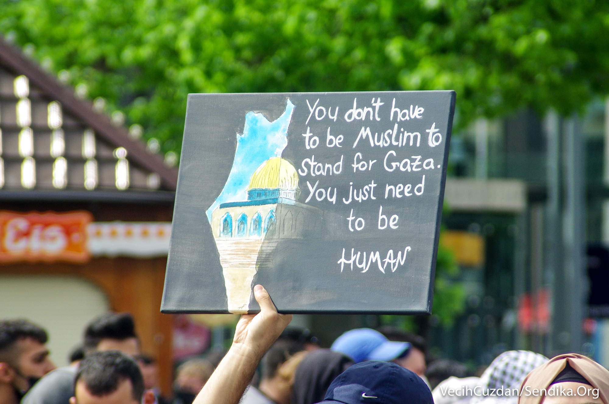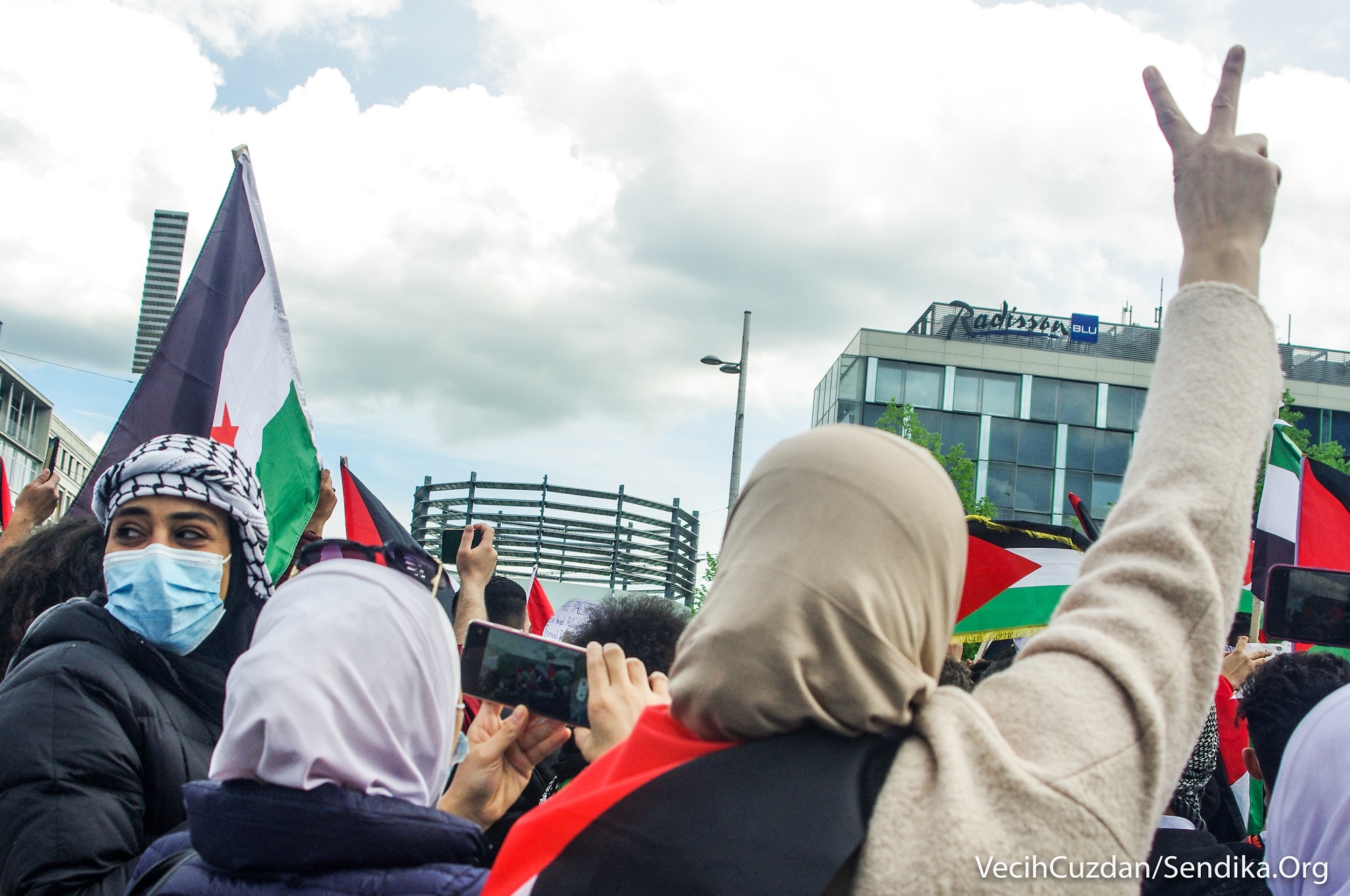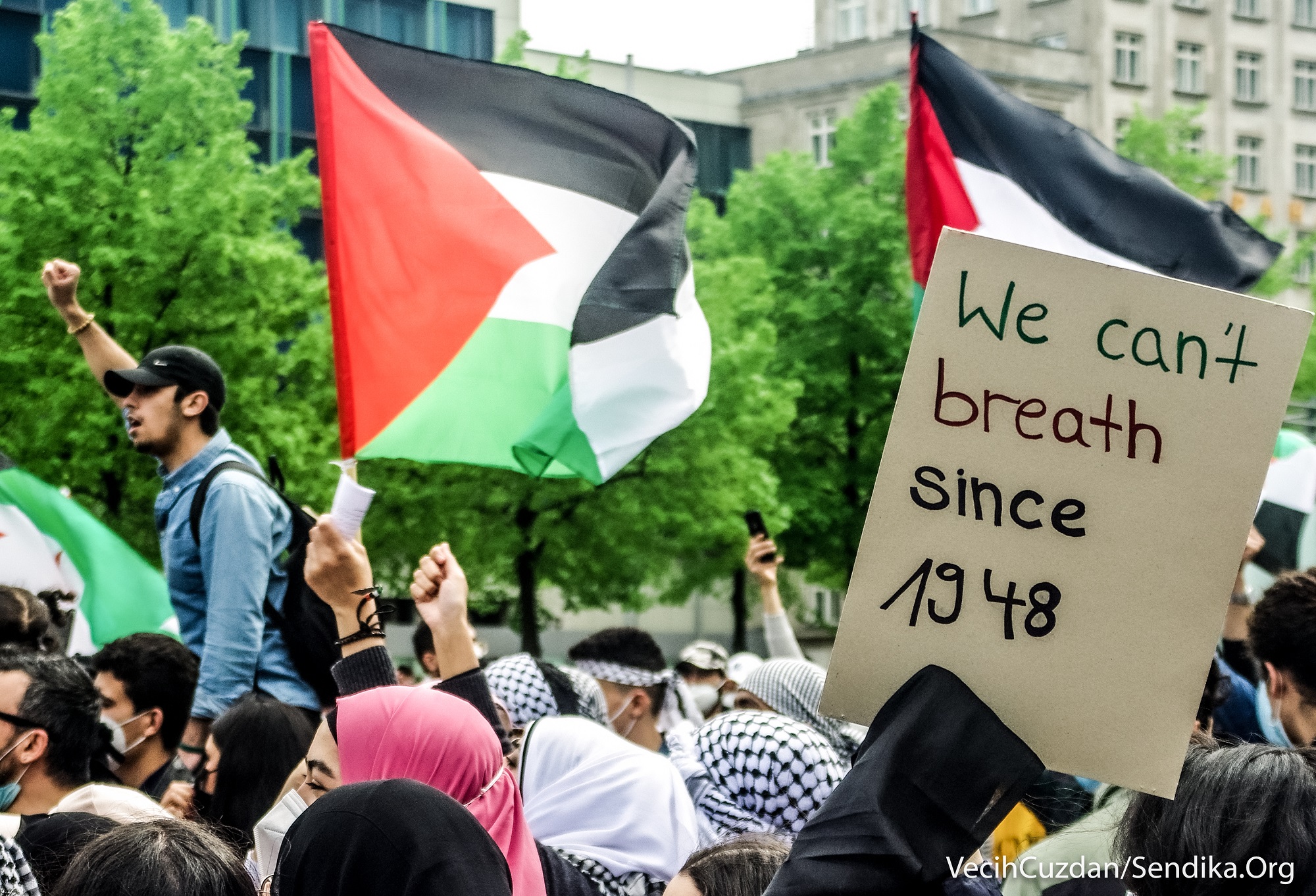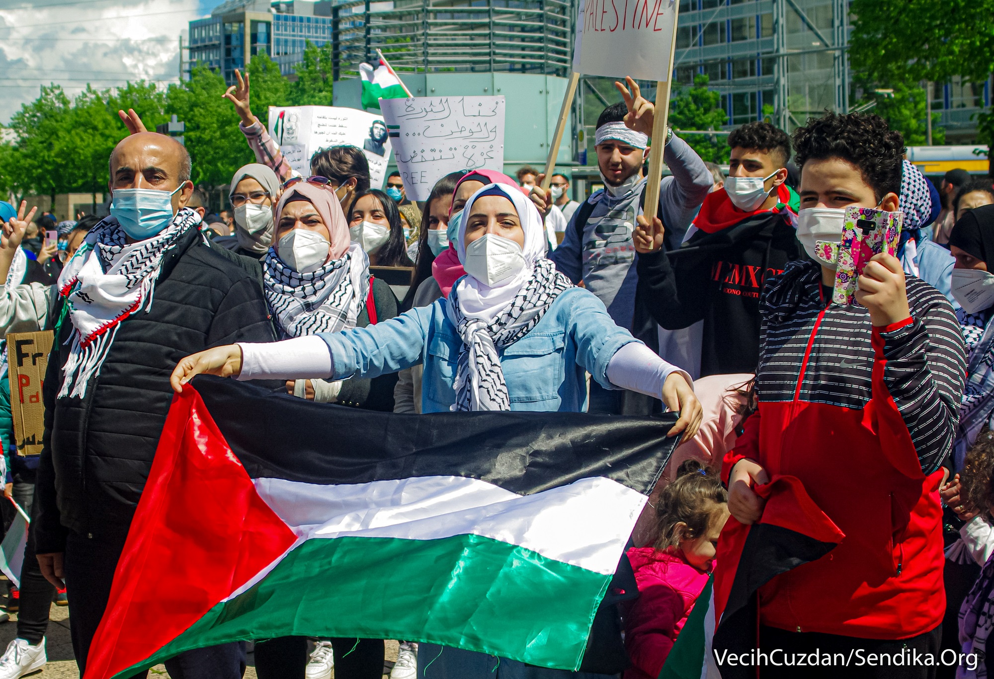 Arap ve Yahudi gençlerin çağrısıyla Augustusplatz Meydanı’ndan bir araya gelen yüzlerce kişi “1948’den beri nefes alamıyoruz”, “Leipzig’den… Filistin’in yanındayız”, “Nakba sürüyor”, “Şeyh Cerrar’ı kurtar”, “Kimin tarafındasın?”, “Siyonist devlet Yahudileri ve Yahudiliği temsil etmiyor… Özgür Filistin”, “Gazze’yi savunmak için Müslüman olmanıza gerek yok, sadece insan olman gerekiyor” yazılı dövizler taşıdı ve sık sık “Özgür Filistin”, “İşgale hayır”, “Enternasyonal dayanışmayı yükselt!”, “Hepimiz faşizme karşıyız” sloganları attı.