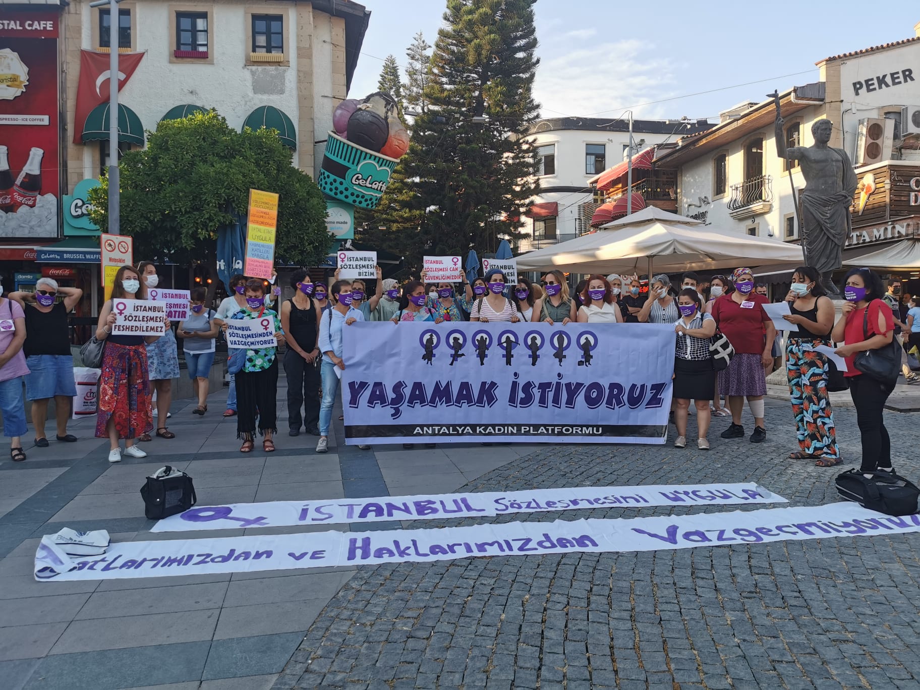 Antalyalı kadınlar “İstanbul Sözleşmesi’nden Vazgeçmiyoruz” diye düzenledikleri eylemde, kadına yönelik şiddet için “tolere edilebilir oranda” ifadesini kullanan Aile ve Sosyal Hizmetler Bakanı Derya Yanık’ı istifaya çağırdı. Kadınlar ayrıca İstanbul Sözleşmesi’ne dair doğru bilinen yanlışları tek tek sıralayarak düzeltti