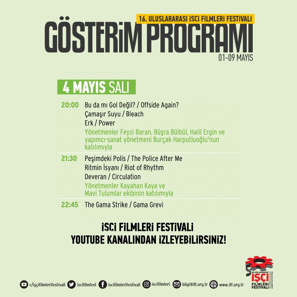 İşçi Filmleri Festivali’nin 4 Mayıs günü gösterimleri, saat 20.00, 21.30 ve 22.45’te İFF YouTube kanalı üzerinden yapılacak