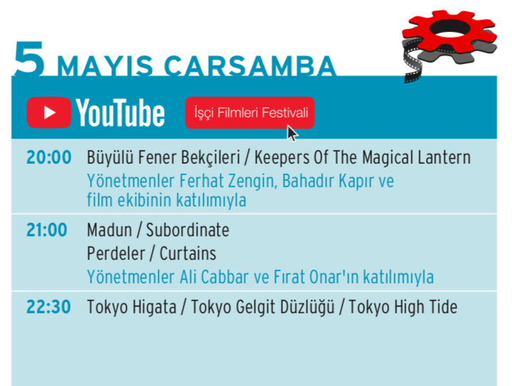 İşçi Filmleri Festivali’nin 5 Mayıs günü gösterimleri, saat 20.00, 21.00 ve 22.30’da İFF YouTube kanalı üzerinden yapılacak