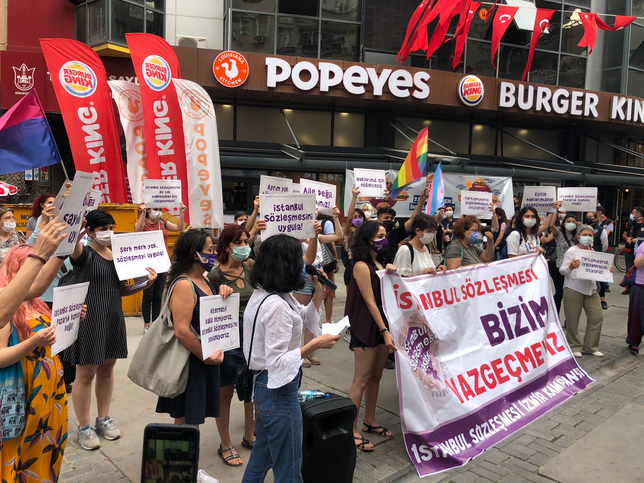 İstanbul Sözleşmesi İzmir Kampanya Grubu Alsancak’ta Türkan Saylan Kültür Merkezi önünde “İstanbul Sözleşmesi’nden vazgeçmiyoruz” diyerek nöbetteydi