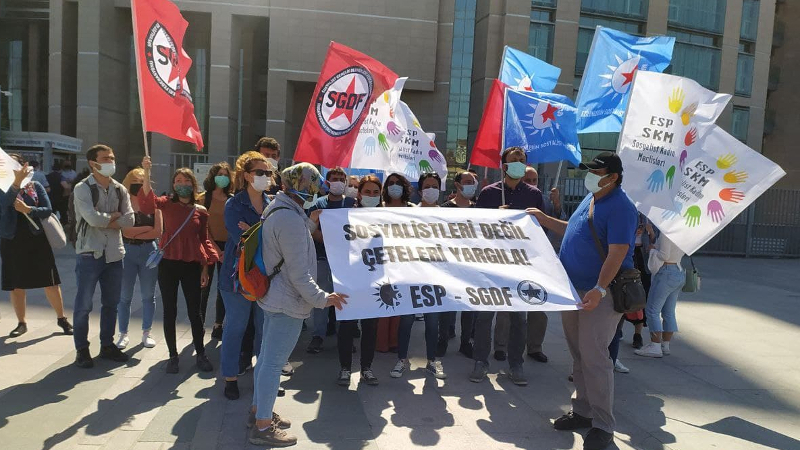 ESP, SKM ve SGDF, Çağlayan’da bulunan İstanbul Adliyesi önünde yaptığı eylemde “Sosyalistleri değil çeteleri yargıla” dedi. 7 Ekim 2020’de gözaltına alınan sosyalistlerin 3 gün sürecek davası bugün başladı. Bugünkü duruşmada savunma yapan 9 sosyalist, cenazeye katılmanın suç sayılmadığının altını çizdi