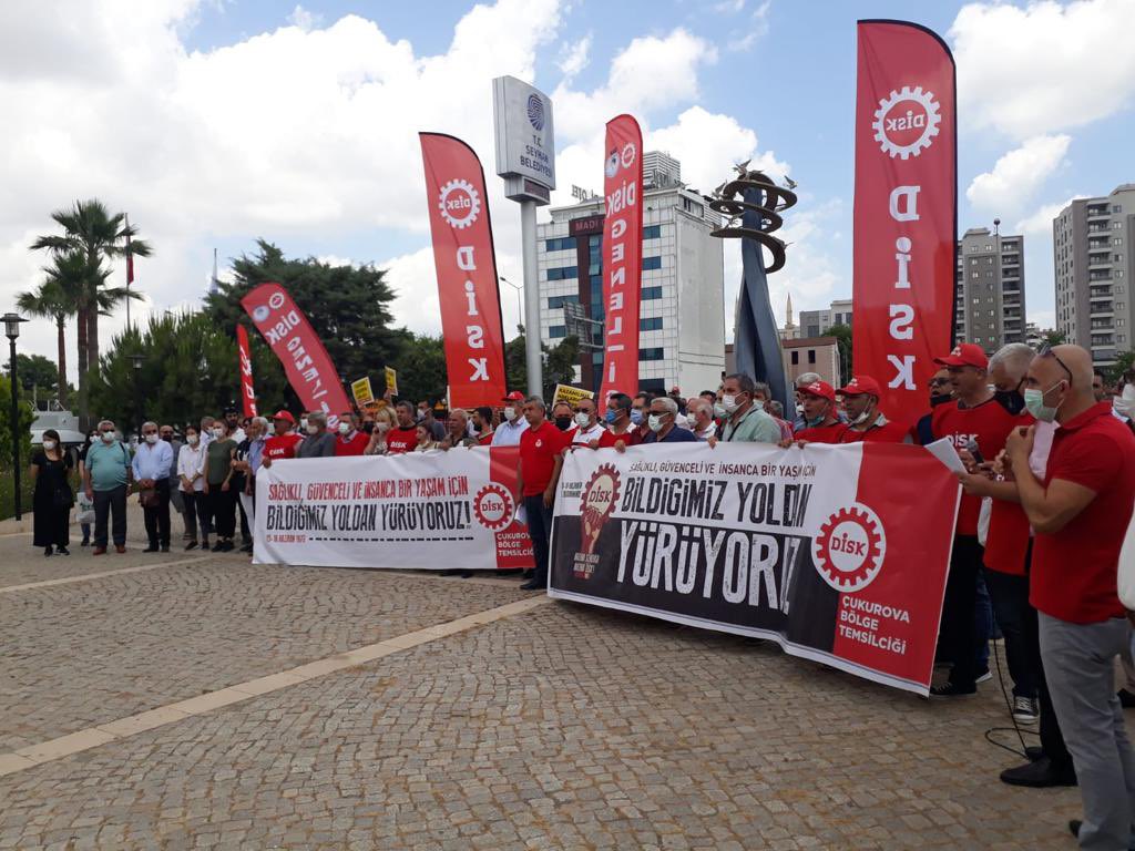 Adana Seyhan Belediyesi Barış Anıtı önündeki basın açıklamasını DİSK Çukurova Bölge Temsilcisi H. Yaşar Gündoğdu okudu.