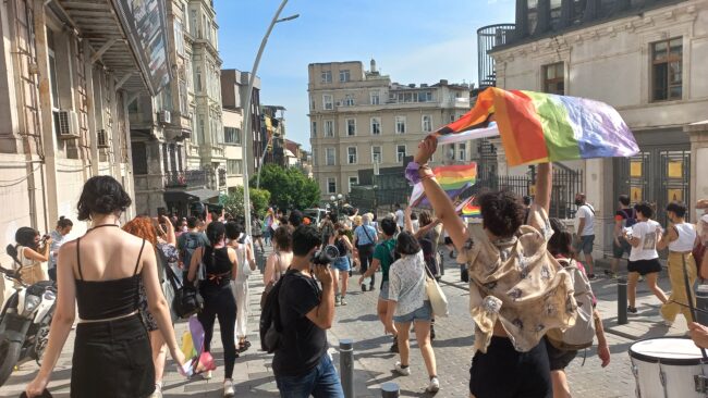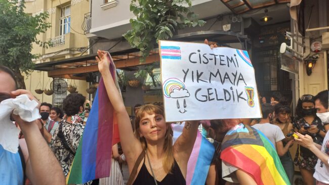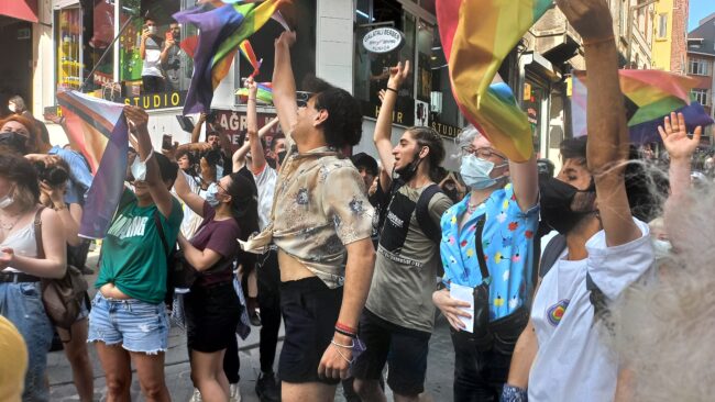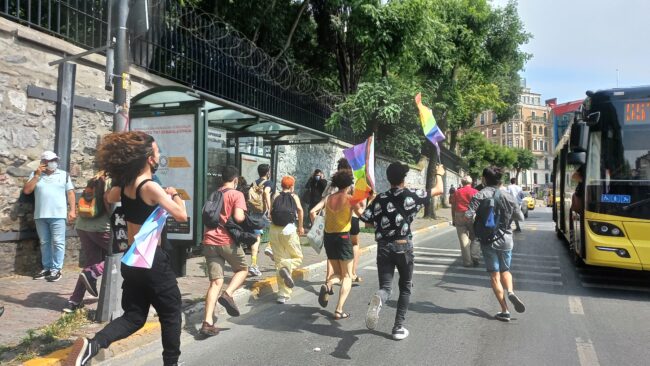Polis saldırısının ardından kitle Mis Sokak’tan Tarlabaşı Bulvarı’na doğru indi. Polis de amirin “süpürün” talimatıyla eylemcilerin ardından gitti. LGBTİ+’lar da “Aşk aşk hürriyet, uzak olsun nefret” sloganlarıyla TRT binası önüne kadar koşarak ilerledi.