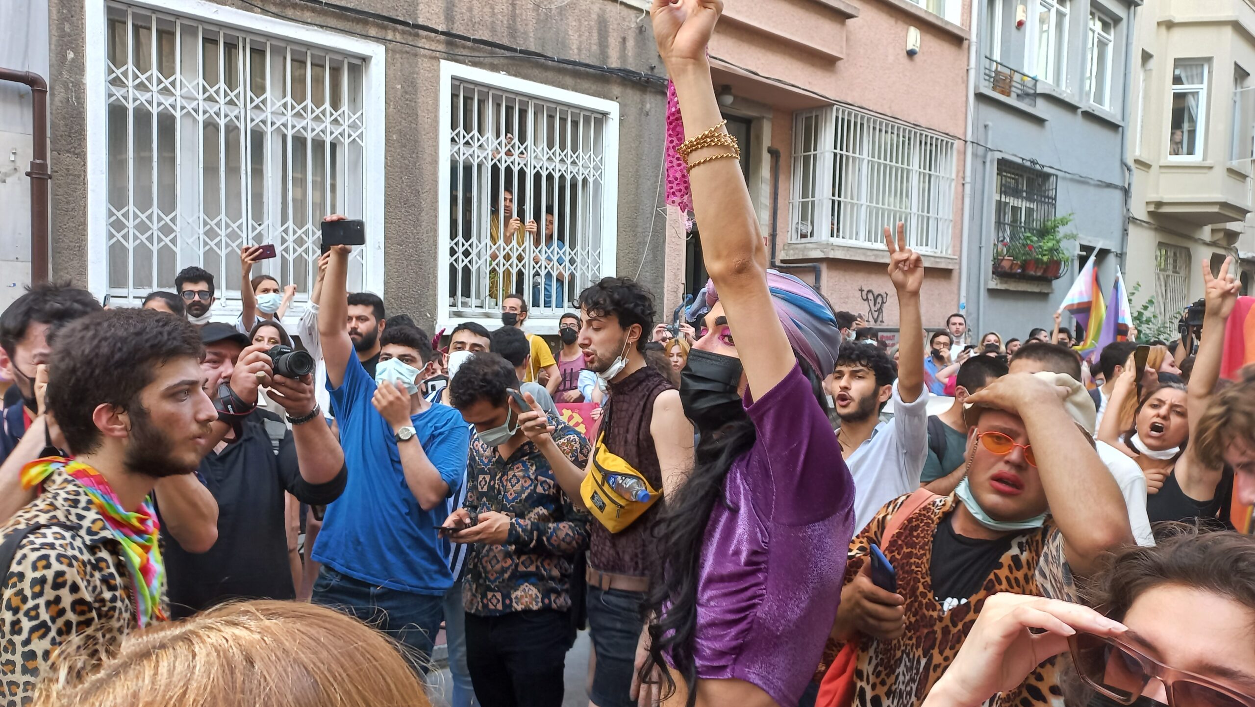 Açıklama ara sokaklarda yeniden okundu. Kitle "Tayyip kaç kaç kaç ibneler geliyor" sloganı attı. #pridehttps://t.co/WLUy6LFf0p pic.twitter.com/T11Jw00Mks