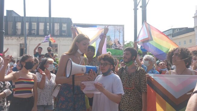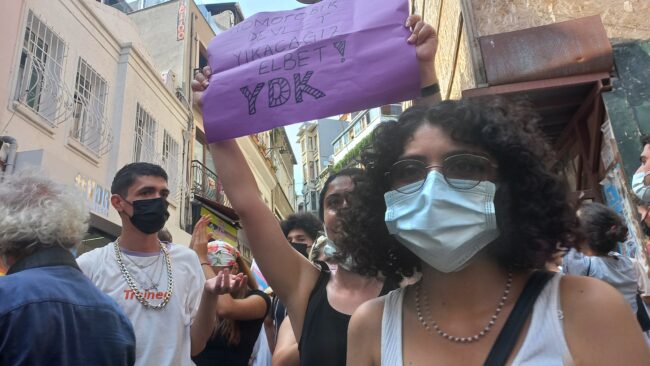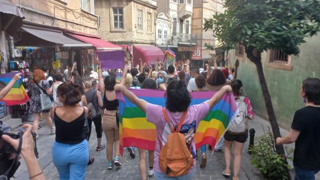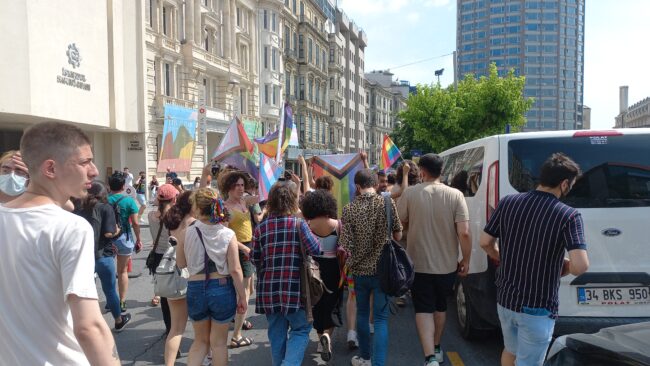 Daha sonra da eylemciler Şişhane’ye kadar yürüdü ve polisle adeta köşe kapmaca oynayarak Tünel Meydanı’nda bir basın açıklaması yaptı. LGBTİ+’lar ekolojik yıkıma karşı mücadele edeceklerini, Deniz Poyraz için adalet istediklerini, İstanbul Sözleşmesi’nden vazgeçmeyeceklerini söyledi. Eylemciler açıklama sonrası “Neredesin aşkım? Buradayım aşkım” sloganları atarken polis bir kez daha saldırdı.