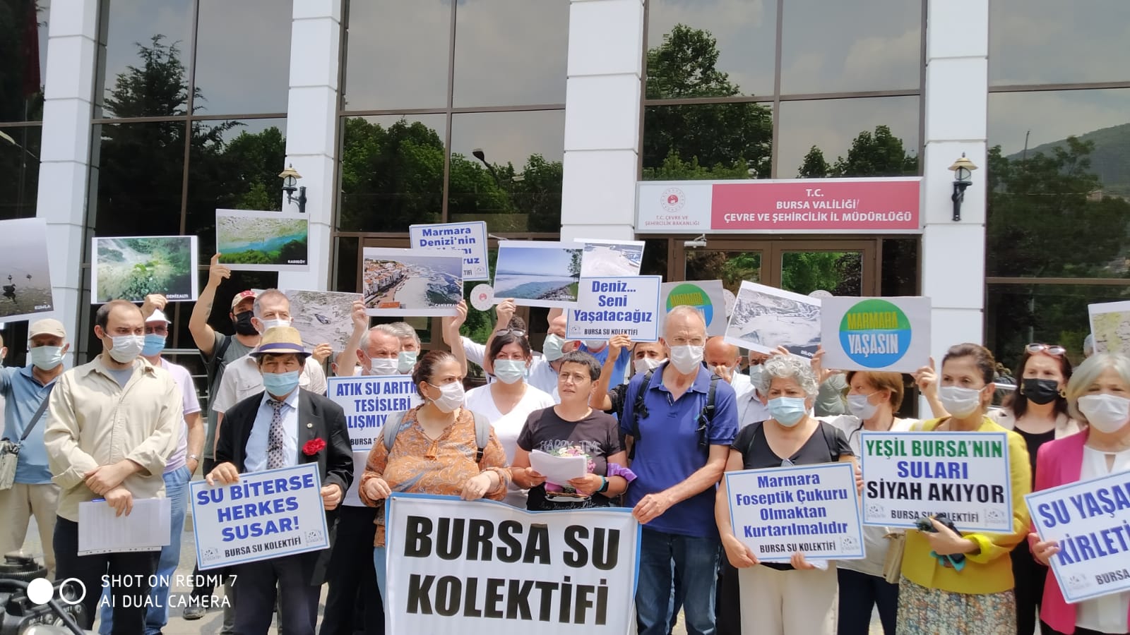 Bursa Su Kolektifi, Çevre ve Şehircilik İl Müdürlüğü önünde açıklama yaptı. Açıklamadan sonra Marmara Denizi’nde yaşanan müsilaj kirliliğe dair topladıkları yaklaşık 1500 kişinin imzalarını Bursa Çevre ve Şehircilik İl Müdürlüğü’ne verdi.