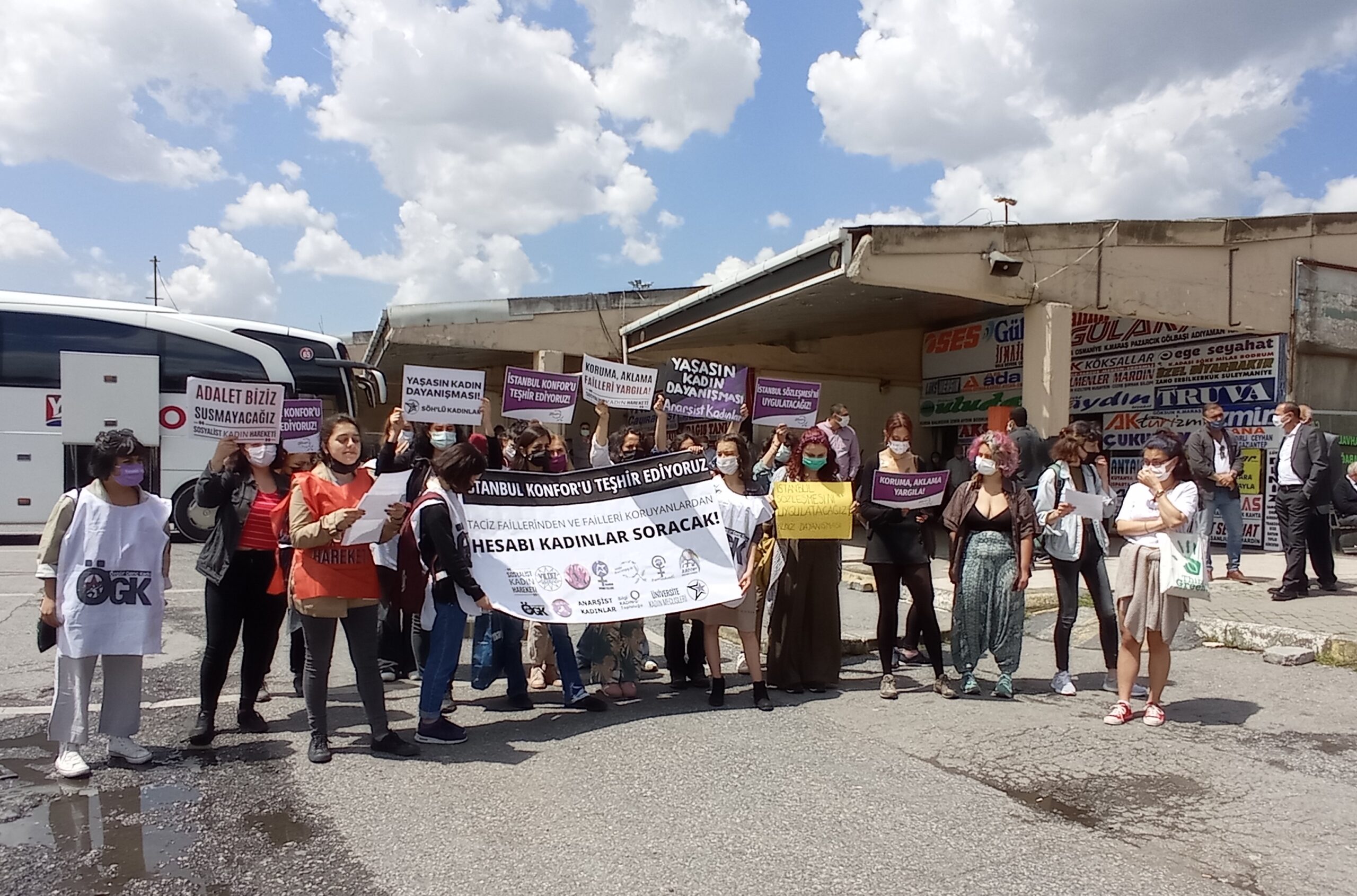 Kadın örgütleri, İstanbul Konfor firması ile yolculuk eden kadının yaşadığı tacizi ve taciz failini koruyan firmayı Harem Otogarı’ndaki ofisi önünde teşhir etti